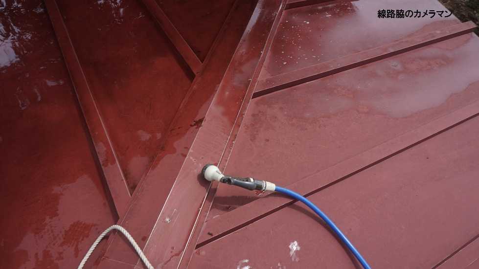 デッキブラシとホースを用意して2階の屋根に登ってみた。
