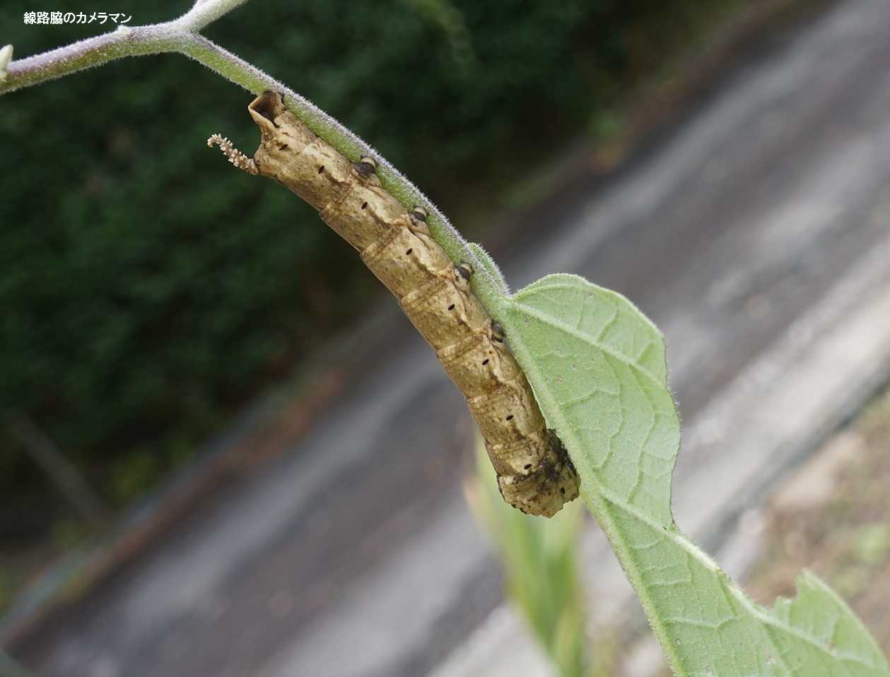 調べてみると「クロメンガタスズメ」という蛾の幼虫で、ナスやトマト、ジャガイモの葉が好きで食い尽くすそうだ。