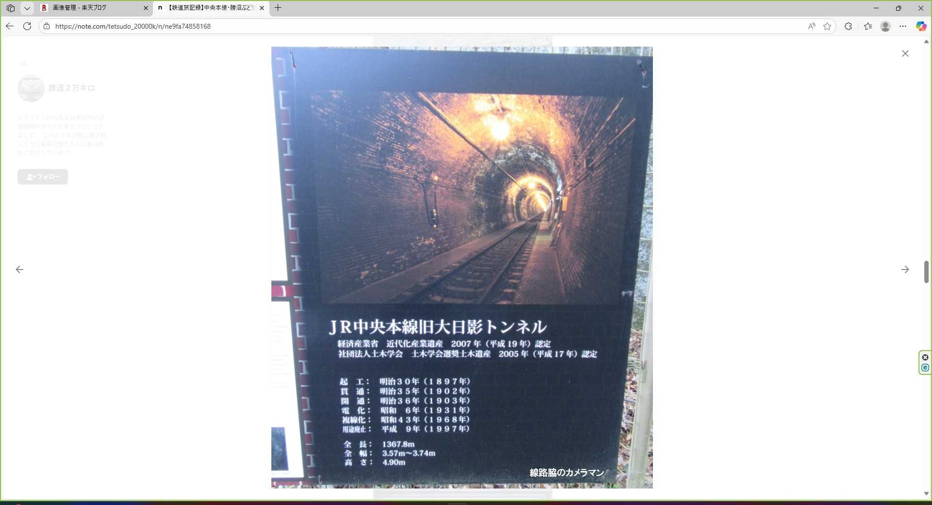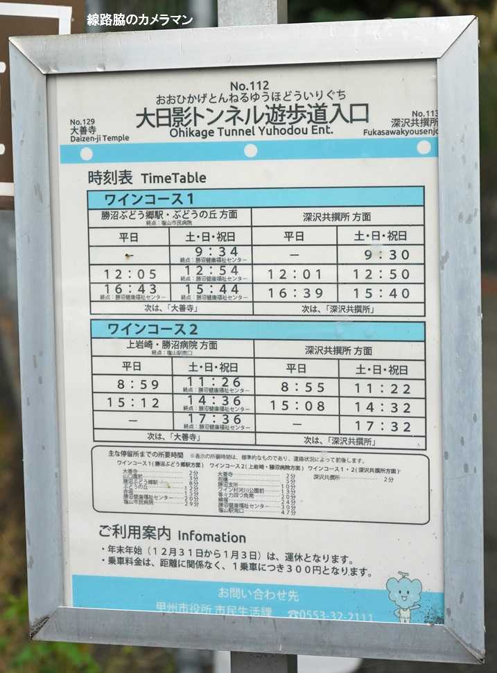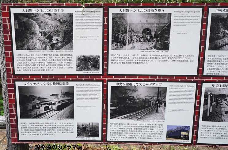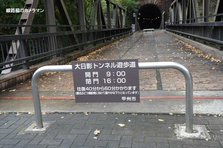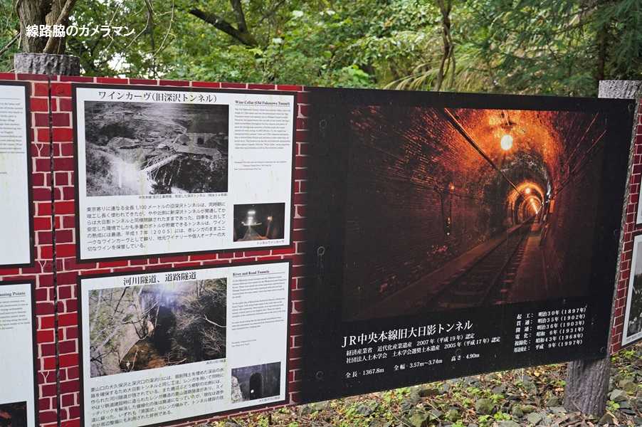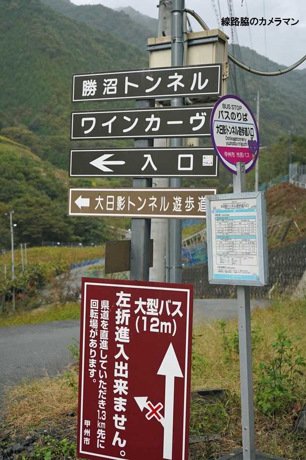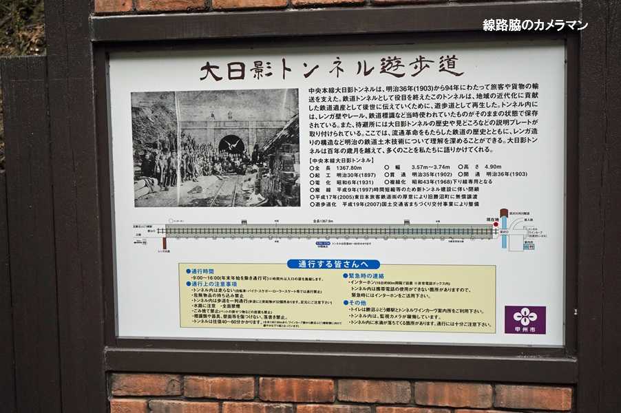山梨の保存車巡りでランチも済んで次は、今は使われていない旧線のトンネルを散歩するのだが、パンフレットを見ると勝沼駅の入り口から入ると大日影トンネル内を片道 1km