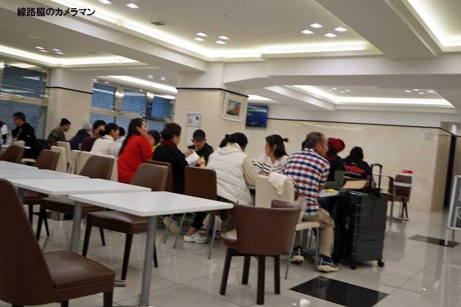 その朝食場所を利用して外国人たちはコンビニで買ってきた夕食をとっている。