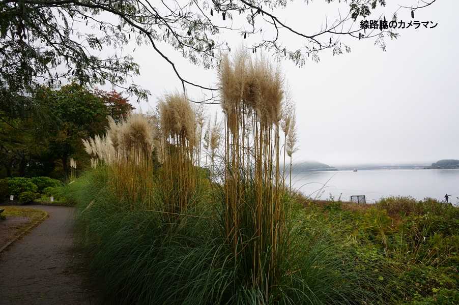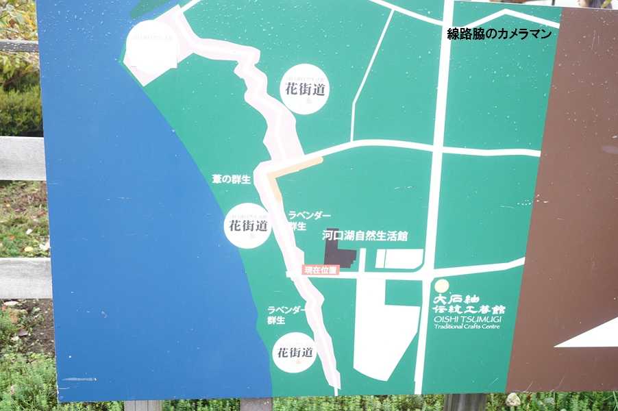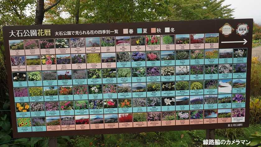 河口湖のほとりに年間を通じて楽しめる花畑「大石公園」がある