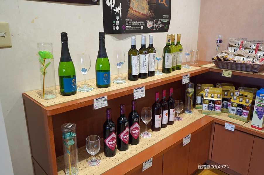 ●JR勝沼駅「河口湖自動車博物館・飛行館」のコッペル蒸気機関車をチラッと見てJR勝沼駅に向かった。勝沼はブドウ畑とワイン工場が多く沿道には多くのブドウ狩園が並んでいる。駅内でもワインの販売やワインが飲める販売機が置いてある。勝沼駅は1913年に大日影信号所が始まりで、当時は勾配がありスイッチバックの駅だったが、1968年にスイッチバックは廃止された。その後、勝沼駅は1995年(平成5年)に地場産品のブドウを付した勝沼ぶどう郷駅に駅名変更となった。ホームは1面2線で、シーズンにより特急が停車する。枕木を活用している。