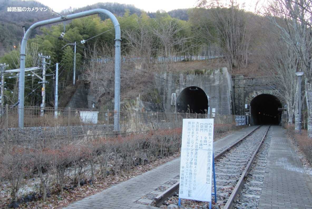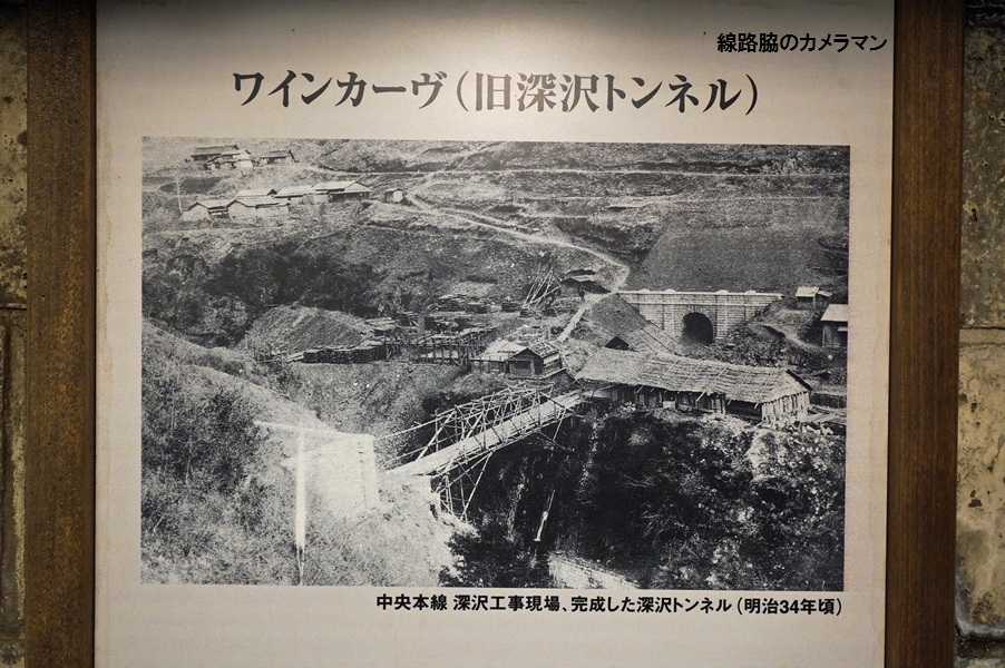 ●旧線トンネル散歩(大日陰トンネル)山梨の保存車巡りでランチも済んで次は、今は使われていない旧線のトンネルを散歩するのだが、パンフレットを見ると勝沼駅の入り口から入ると大日影トンネル内を片道1kmほど歩くことになる。ここは勝沼寄りの入り口、左が新トンネル。しかし、良く見ると反対側の東京側の入口には続いている深沢トンネルがありワインカーヴも見られる事が分かった。食事した古民家からも近いこともありこちらに行くことにした。V字型の谷の中にトンネルはある。観光地になっているのでバスも運行されている。ブドウ畑には動物(人間も?)除けのため電気柵が設けれれている。人里離れた大きな山中に細い道があり、そこに2つのトンネルが現れた。無料駐車場もあり早速トンネル探検にでかけた。この鉄橋も味がある。大日影トンネルは1896年(明治29年)にレンガ積みで造られ、1903年に単線で開通した。入口には説明板がある。1968年には、複線化のため並行して上り用の新大日影トンネルが開通したため単線の大日影トンネルは下り専門となった。その後、下り専門の新大日影トンネル第2が開通するとお役御免となったが、2005年にJR東日本から旧勝沼町に無償譲渡され遊歩道として活用されることになった。避難所。老朽化のため何度か補修対策が行われていたが、改修工事も終わり2024年3月に8年ぶりに再び遊歩道として使用されている。大日影トンネルは全長1367,8m、高さ4.9m、幅3.57〜3.74mで、9時〜15時まで見学できる。最後に係員が両出入口を閉鎖に来る。線路の真ん中には水抜き用の用水路があり、勝沼方面に向かって25パミール(1000mで25mの差がある)の下り勾配が付いている。トンネル内には所々に大小の待避所や休憩所が30カ所ほど作られている。漏水対策のため天井に網目模様の防水版がつけられた。このレンガはイギリス積みだろう。東京からの距離を示す標識。続く、、、