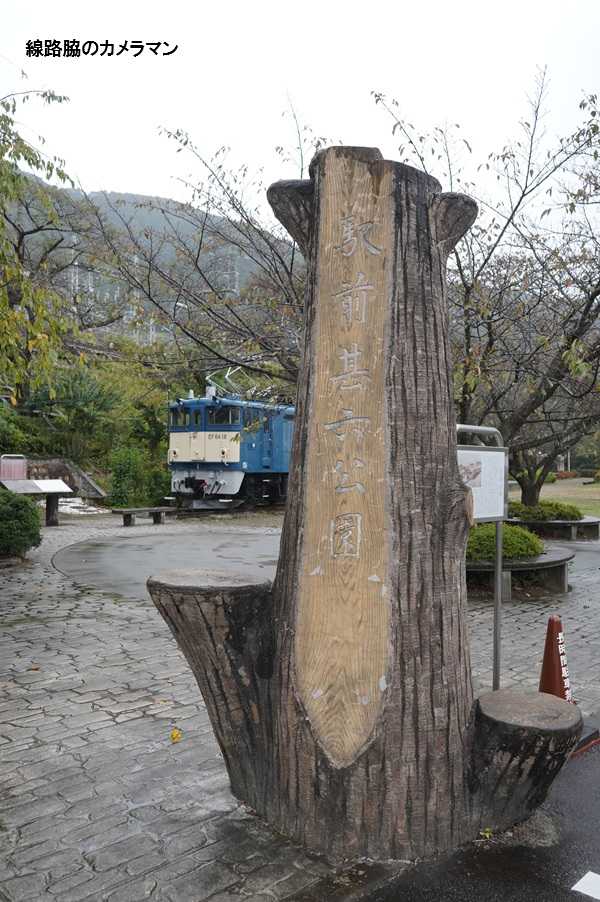 ●山梨保存車巡り(EF6418)勝沼ぶどう郷駅の隣には電気機関車EF6418号機の保存車がある。2022年に、クラウドファンディングで化粧直しをしたので綺麗な状態を保っている。EF64型は山岳勾配用の機関車で、1966年東芝府中工場(製造番号5102544-4)製、主に中央線の甲府や八王子で活躍し、2005年に廃車となった。また、保存場所は以前スイッチバックとなっていた旧線上で当時のホームの一部がある。現在の線路は一段上を走っている。この車輪は何の車両でしょうか。この場所は甚六桜公園として桜の名称ともなっている。
