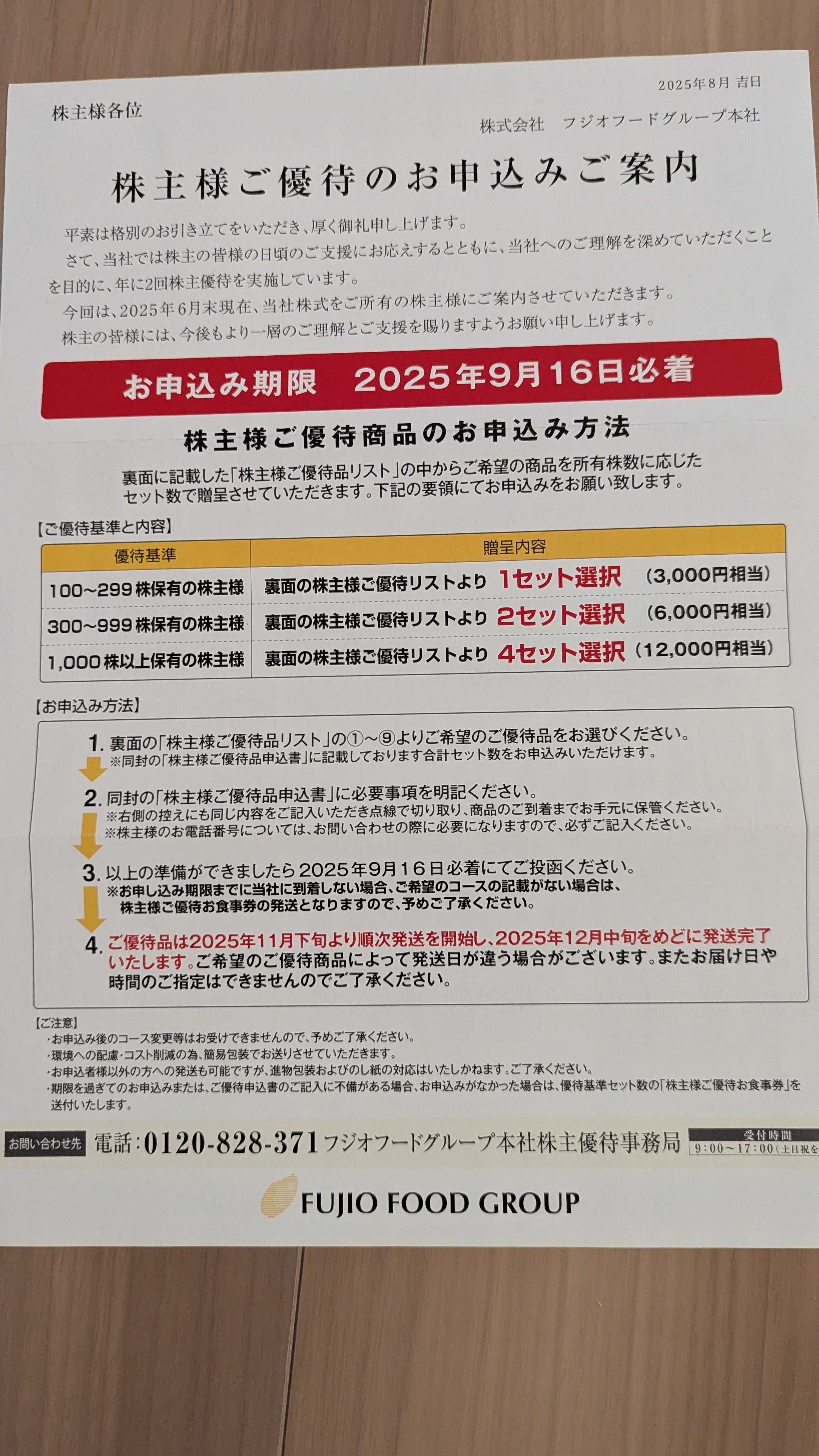 今日も最近届いた優待を紹介していきます3501 SUMINOE 今回紹介するのはカーペット大手の住江織物です。6月優待2025/10/10時点の株価は2141円、予想配当利回り3.17%(68円)です。今期予想PERは5.1、PBRは0.52です。優待内容は100株以上の保有で3000円相当のオリジナル商品から一品の選択になります。実際に届いた案内が以下になります。意外と申し込み期限が短いので注意が必要ですね。穴吹興産は半生うどんが有名です。ただ私は過去2年取得してますが、半生うどんを頼んだことがありませんでした。今回満を持して半生うどんを注文いたしました。届くのが楽しみです。さて穴吹興産ですが四国を中心にマンション分譲を行う不動産企業です。地域密着型のビジネスモデルを採用し、地元のニーズに応じた住宅供給を行っています。また、グループ企業を通じて、地域スーパーや人材派遣、介護医療など多岐にわたる事業を展開しています。2025年度6月期決算は減収減益で着地しましたが、2026年度は増収増益予想です。不動産価格の高騰が響いているようです。バリュー投資家の観点からみると割安になります。配当もよいため、持っていて損はない銘柄だと思います。優待投資家の観点からみると、1年に一回美味しい食べ物がいただけるため、持っていて損はない目柄だと思います。ということで総合的にみるとで配当と優待で堅実なリターンが見込める縁の下の力持ち的銘柄だと思います。