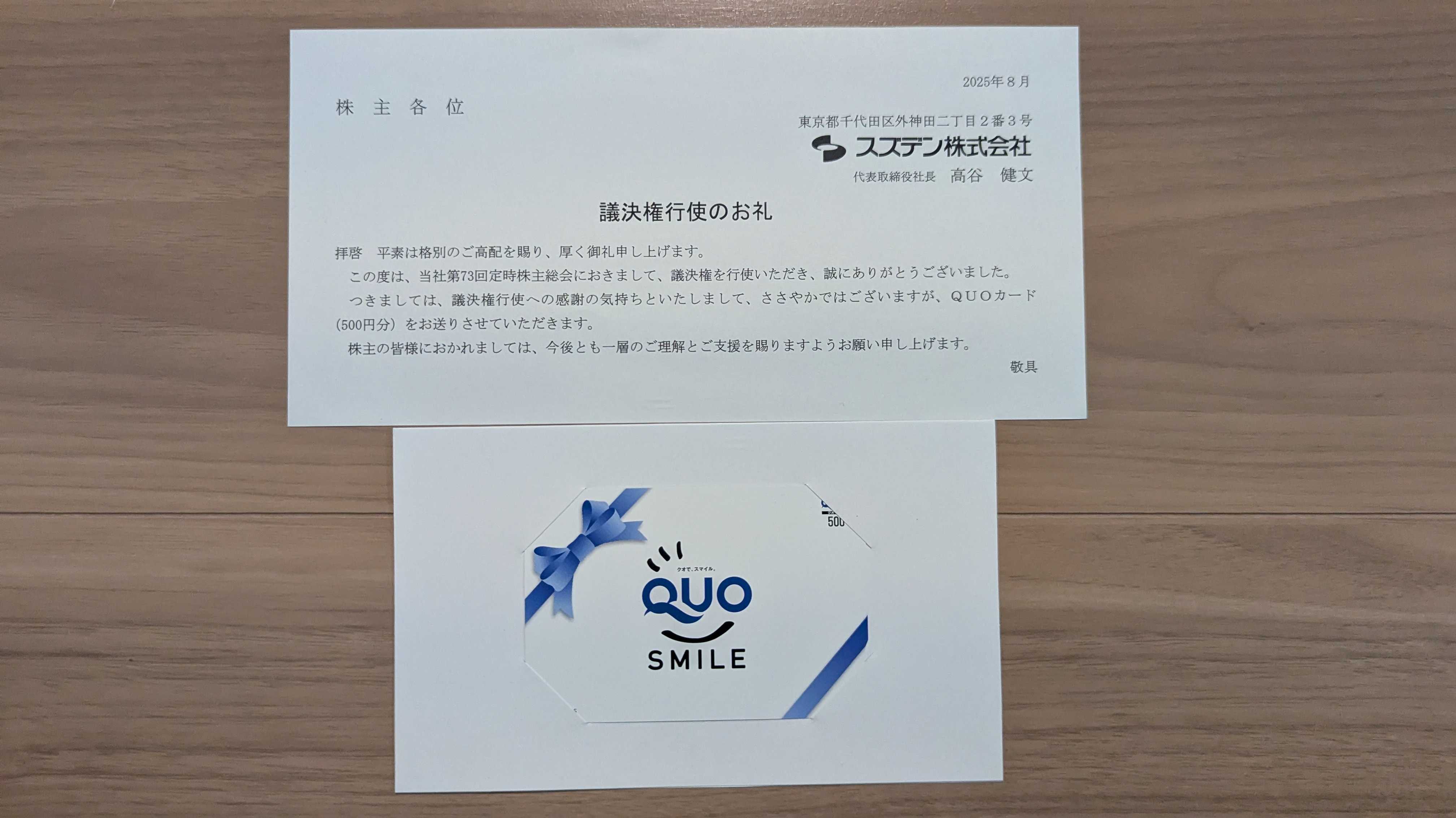 今日は議決権行使返礼品の紹介です。7480 スズデンいただいたのは標準品のクオカードです。実際に届いたものが以下になります。標準のクオカードです。こうやって議決権行使のお礼がいただけると嬉しくなりますね。