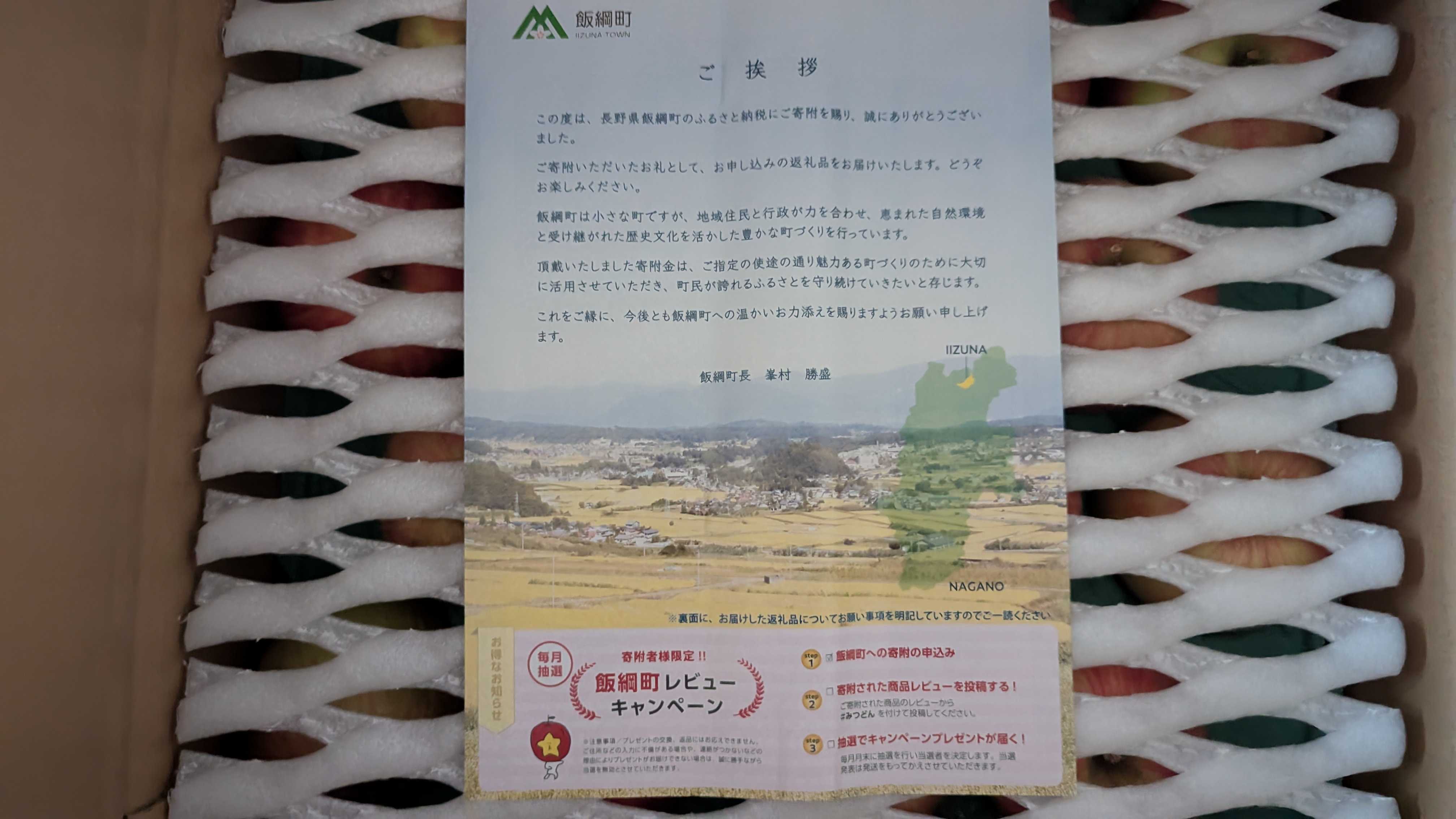 今回紹介するのは長野県飯綱町 リンゴ サンつがるです。16000円でリンゴのサンツガル10kgがいただけます。【楽天市場】【ふるさと納税】 りんご サンつがる 訳あり 10kg 沖縄県への配送不可 令和7年度収穫分 宮本ファーム エコファーマー 減農薬栽培 長野県 飯綱町 〔 リンゴ 林檎 果物 フルーツ 信州 長野 16000円 〕発送期間:2025年9月上旬~2025年9月下旬:長野県飯綱町残念ながらもう申し込みは終了してしまいましたね。実際にいただいたものが以下になります。まずは紹介状が入っていました。リンゴは40玉入っていました。ちなみにこれは一段目でこの下に2段目があります。これだけ立派なリンゴがいただけるのはありがたいですね。我が家は毎朝りんごを食べるくらいリンゴ好きなので、ありがたくいただこうと思います。さてこのふるさと納税の返礼品を送付していただいた長野県飯綱町ですが、長野県の北部に位置します。信州リンゴの一大産地で、そのためか町内にはアップルミュージアムといってリンゴに焦点を当てたミュージアムもあるなどリンゴ押しで地域活性化を行っています。美味しいリンゴが食べられるのもこういう農家の方のおかげということで寄付いたしました。今後もリンゴの生産を頑張っていただきたいですね。