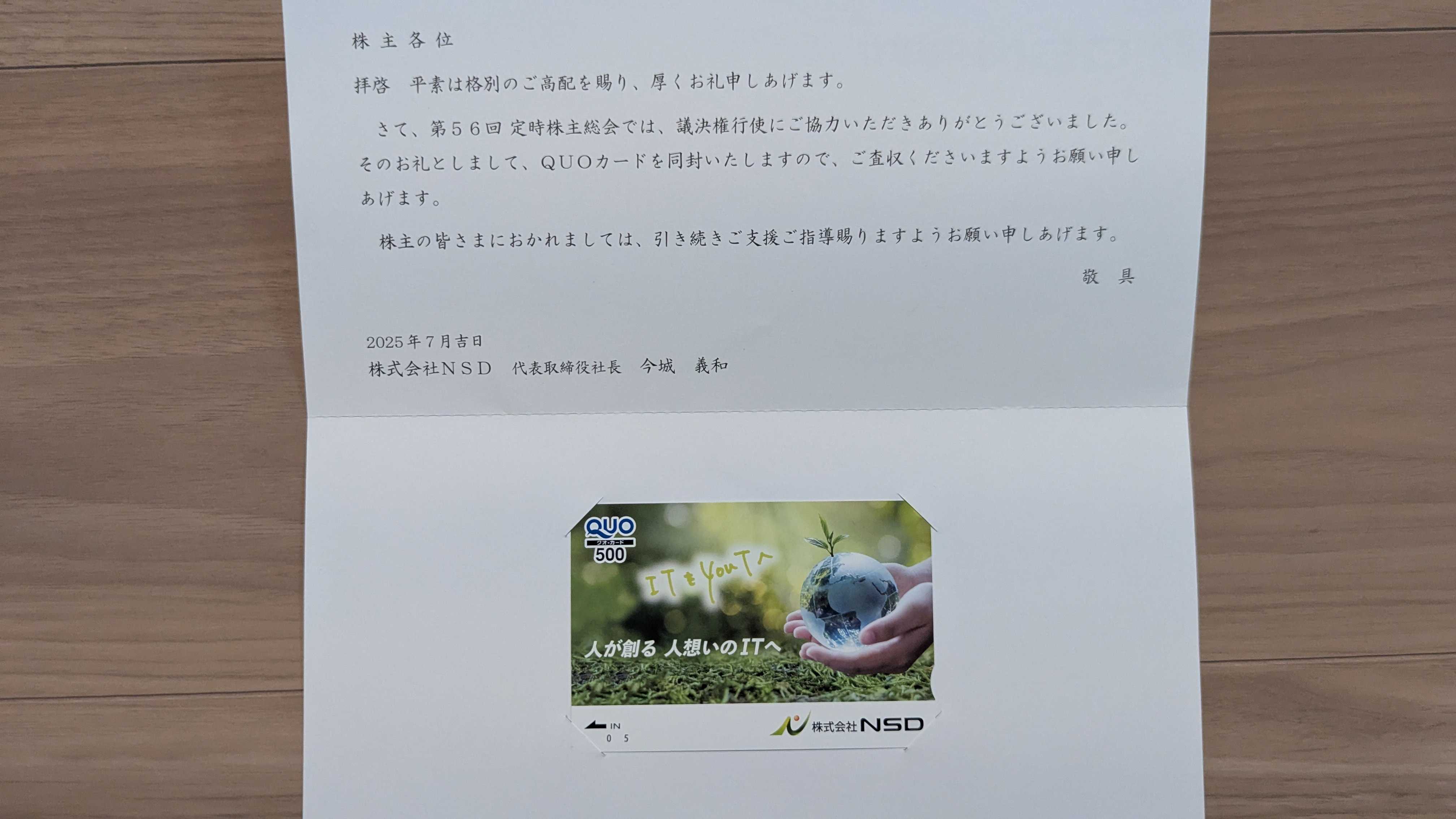 今日は議決権行使返礼品の紹介です。9759 NSDいただいたのはオリジナルのクオカードです。実際に届いたものが以下になります。私はすべての保有株に対し、議決権行使をしているのですが、こうやって議決権行使のお礼がいただけると嬉しくなりますね。