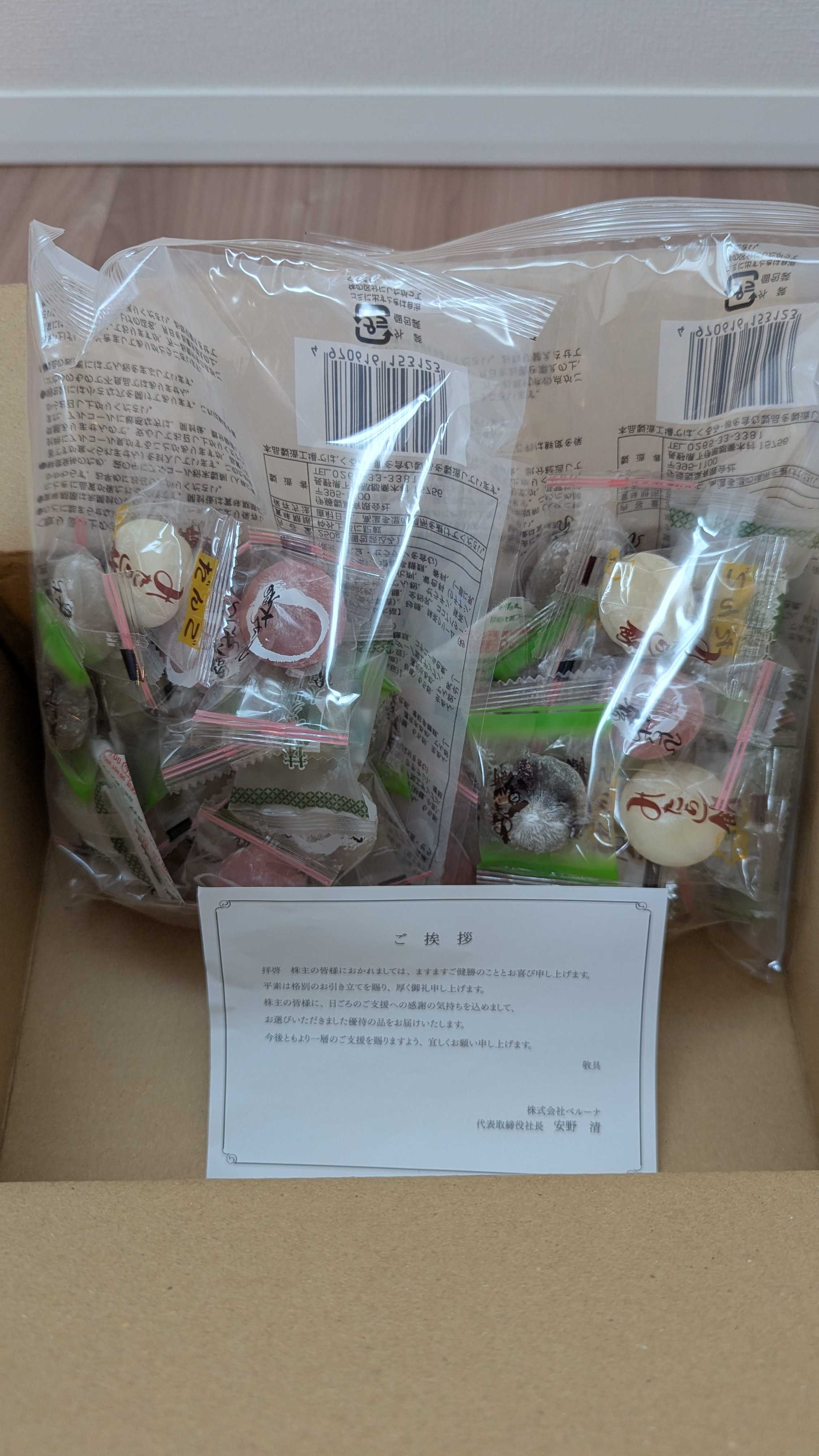 今日は最近?注文した優待が到着したのでその紹介です。9997 ベルーナここは以前届いた優待案内でお菓子を注文していました。株主優待案内到着 9997 ベルーナ | へっぽこトレーダーの徒然日記 - 楽天ブログ実際に届いたものが以下になります。一口大福2袋ですね。以下のサイトで売っているもののようです。5種のやわらかひとくち大福3袋 - 食品通販のベルーナグルメ【公式】食べてみましたがいろいろな味が楽しめて美味しかったです。個包装なので職場で間食で食べるのによいと思います。