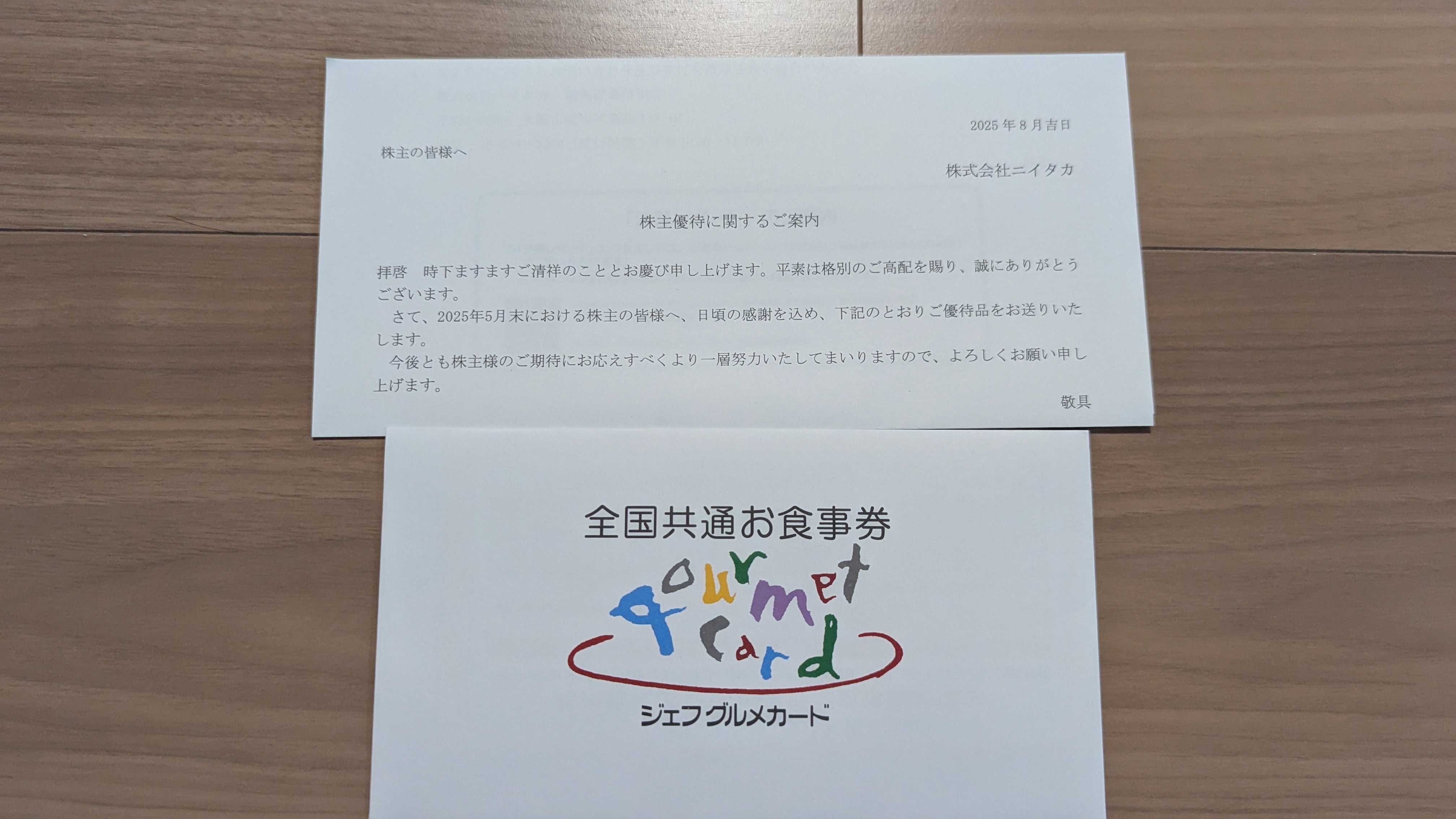今日も最近届いた優待を紹介していきます4465 ニイタカ今回紹介するのは業務用洗剤や固形燃料の製造を行うニイタカです。5,11月優待2025/2/7時点の株価は1941円、予想配当利回り4.12%(80円)です。今期予想PERは11.9、PBRは1.67です。11月の優待内容は保有数に応じたジェフグルメカードです。具体的には以下になります。100株以上 500円相当1000株以上 5000円相当 私は100株保有ですので、500円分になります。実際に届いたものが以下になります。ジェフグルメカードは飲食店の優待での支払いで端数が出たとき助かります。ニイタカは、業務用洗剤や固形燃料などを製造する会社になります。消毒用アルコールを販売しており、皆さんもコロナ禍の時は一度はお世話になっていると思います。2025年度5月期の決算では増収増益でしたが、2026年度は増収減益の予想です。原材料や人件費の高騰を吸収しきれなったようです。バリュー投資家の観点からみるとやや割安ですが、売上や利益が安定した銘柄です。短期間の大きな成長は見込めないですが、安定したリターンが見込めると思います。優待投資家の観点からみると優待による飲食店の支払いで端数が出たときのジェフグルメカードは大変ありがたいです。配当も高いため安定したリターンが見込める銘柄です。総合的にみると優待用に長期保有に向いた銘柄だと思います。