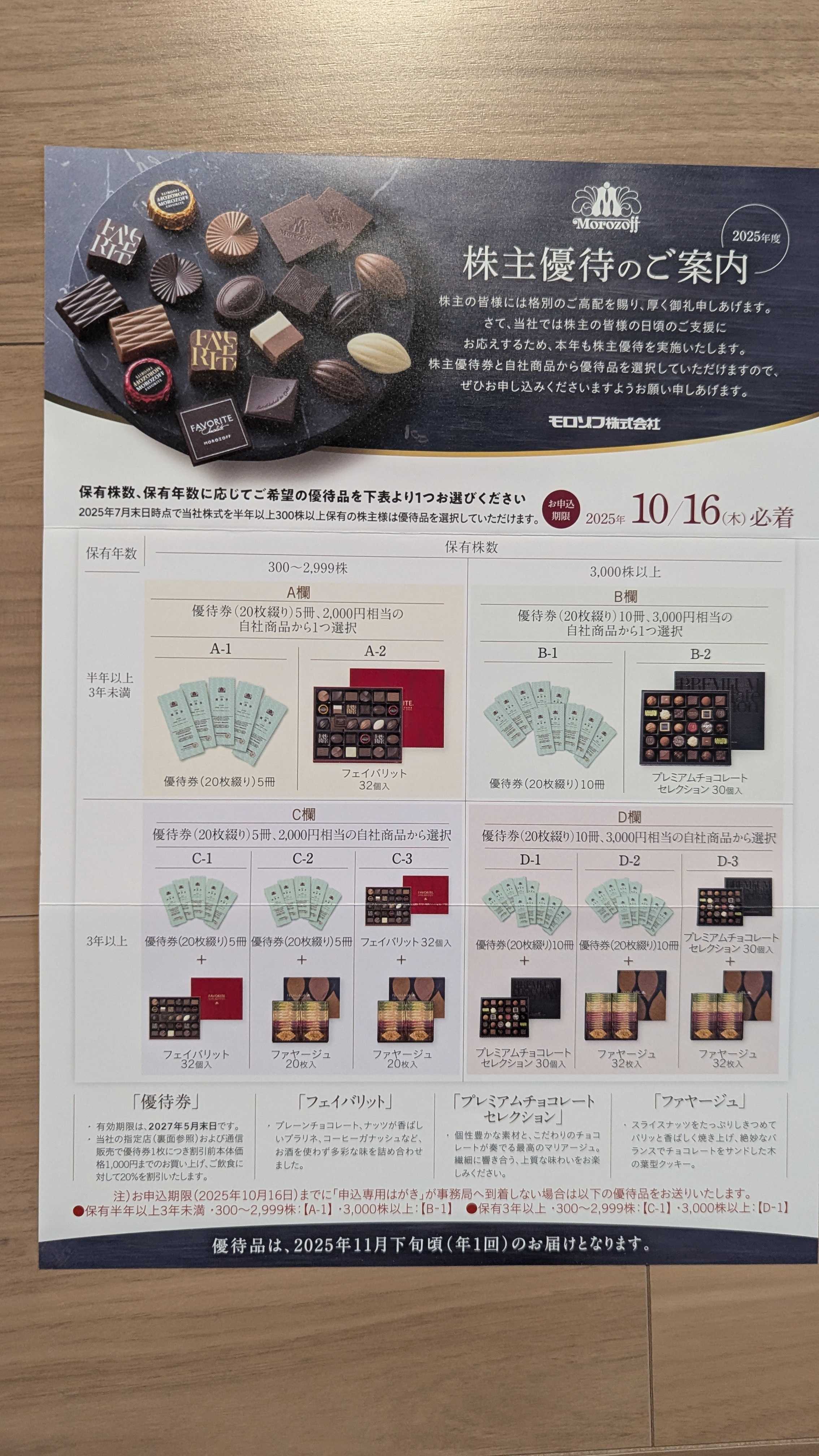 2217 モロゾフ 今回紹介するのは洋菓子大手のモロゾフです。7月優待2025/9/29時点の株価は1578円、予想配当利回り0.89%(14円)です。今期予想PERは55.0、PBRは1.64です。優待内容は100株以上保有で保有年数に応じて以下が頂けます。①優待割引券もしくは商品②オンライン割引券①については送られてくる優待案内が分かりやすいです。優待割引の場合、1枚に付きモロゾフの飲食代が20%割引できます。私は300株3年未満ですので、A欄からの選択になります。私は今回もA-2のフェイバリットを選択しました。ここのチョコレートは高級感があるので家族にも人気です。届くのが楽しみです。モロゾフは、チョコレートや洋菓子の製造・販売を主力とする企業であり、特にバレンタインデーやホワイトデーのギフト商品で知られています。神戸を拠点に、全国の百貨店や専門店で展開しており、喫茶・レストラン事業も手掛けています。2025年度1月期は増収減益で、2026年度も増収減益予想です。原材料や人件費の高騰や輸送費用の上昇等で利益を価格転嫁できていないようです。バリュー投資家の観点からみるとかなり割高で、知名度という企業価値の分高くなっている感じです。優待投資家の観点からみると、普段の生活を豊かにしてくれる優待です。総合的にみると大きなリターンを狙うのではなく、優待を楽しみにもつには向いた銘柄だと思います。