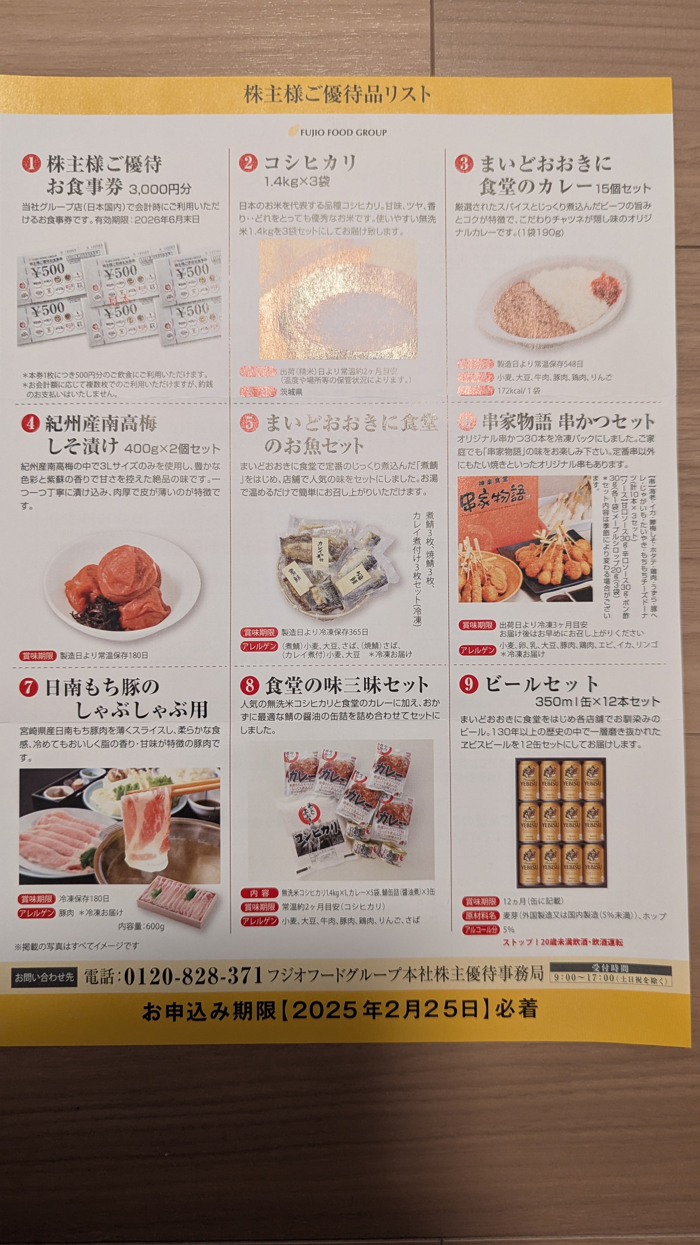 優待内容は保有数に応じた自社商品もしくは優待食事券です。