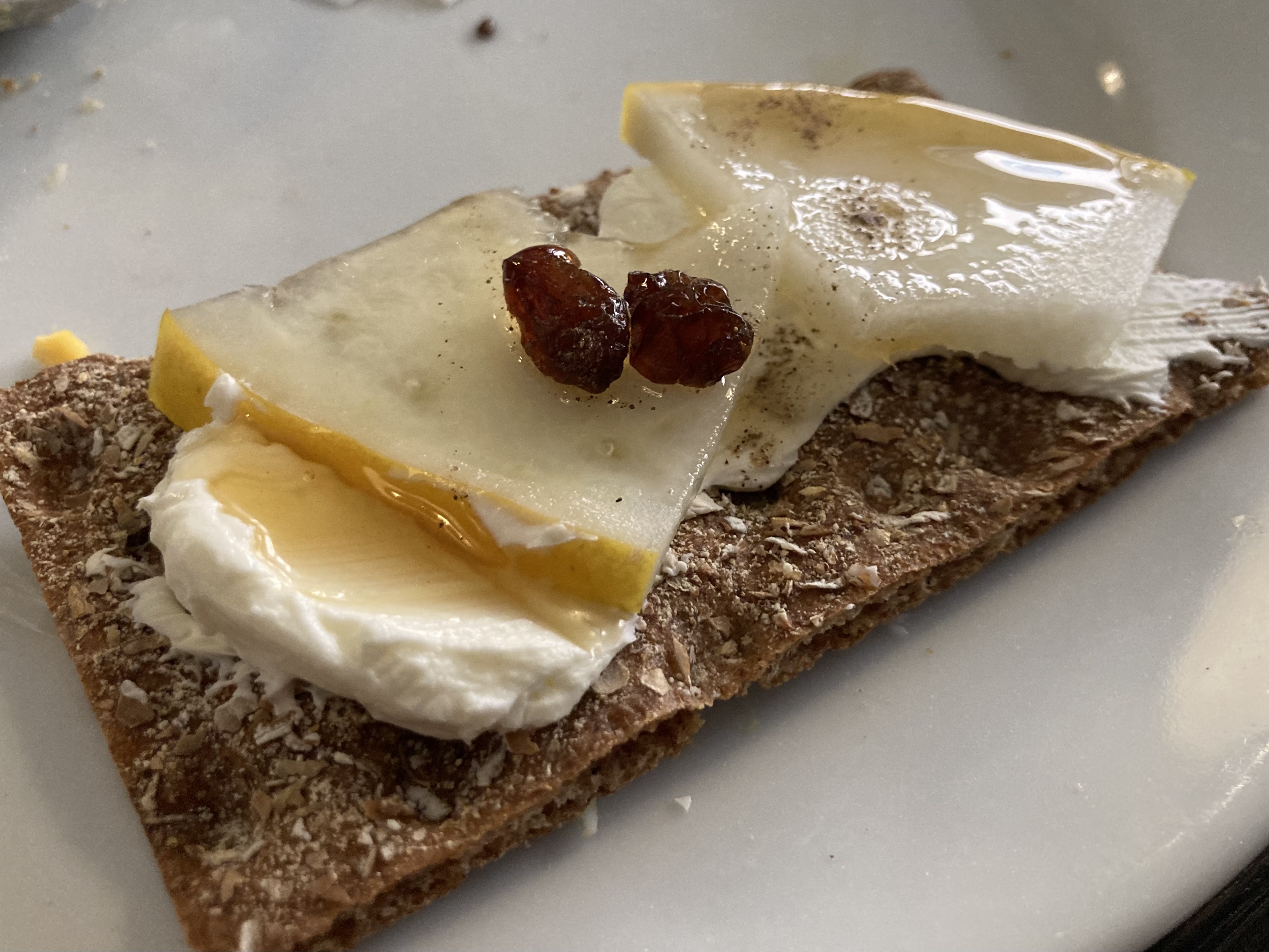 何かわからないフルーツにクリームチーズとハチミツ、レーズンにシナモンペッパー。