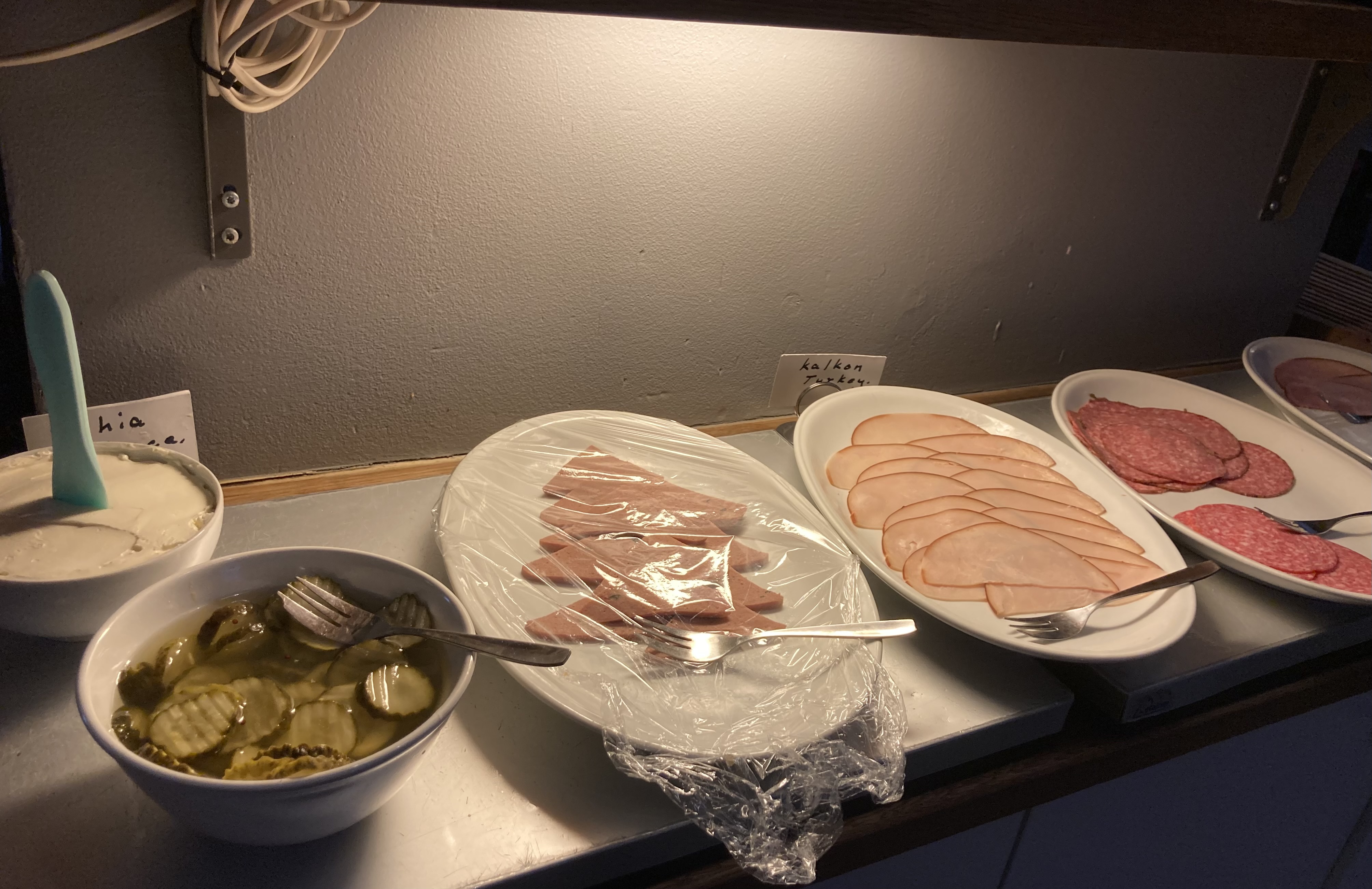 ハムがターキーやペッパーポークなど4種、レバーやチーズも。バター、クリームチーズ、ピクルス。クリームチーズが信じられないくらい美味しい。