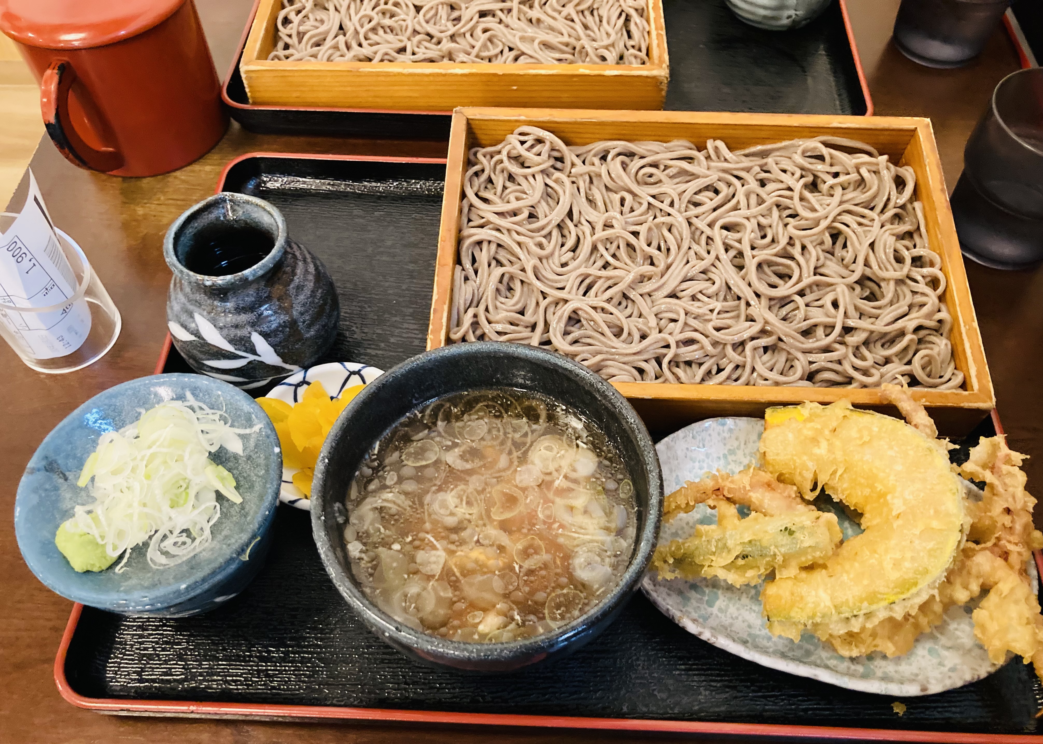 蕎麦がとにかく美味しい!大きなゲソ天が2つ、オクラと厚めのカボチャ、サックサク。