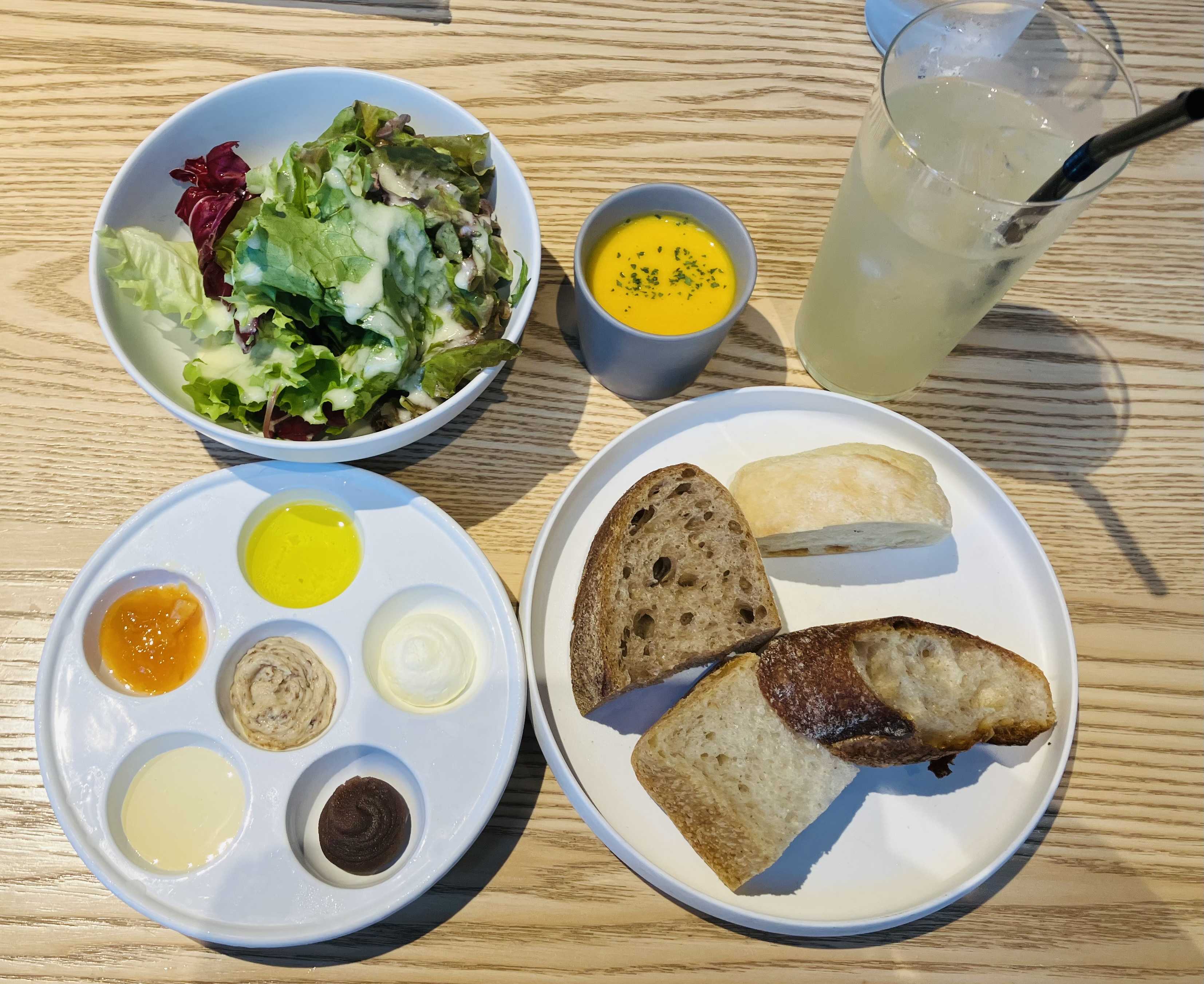 サラダとかぼちゃスープ、6種のディップ、そしてリベイクされたパン。