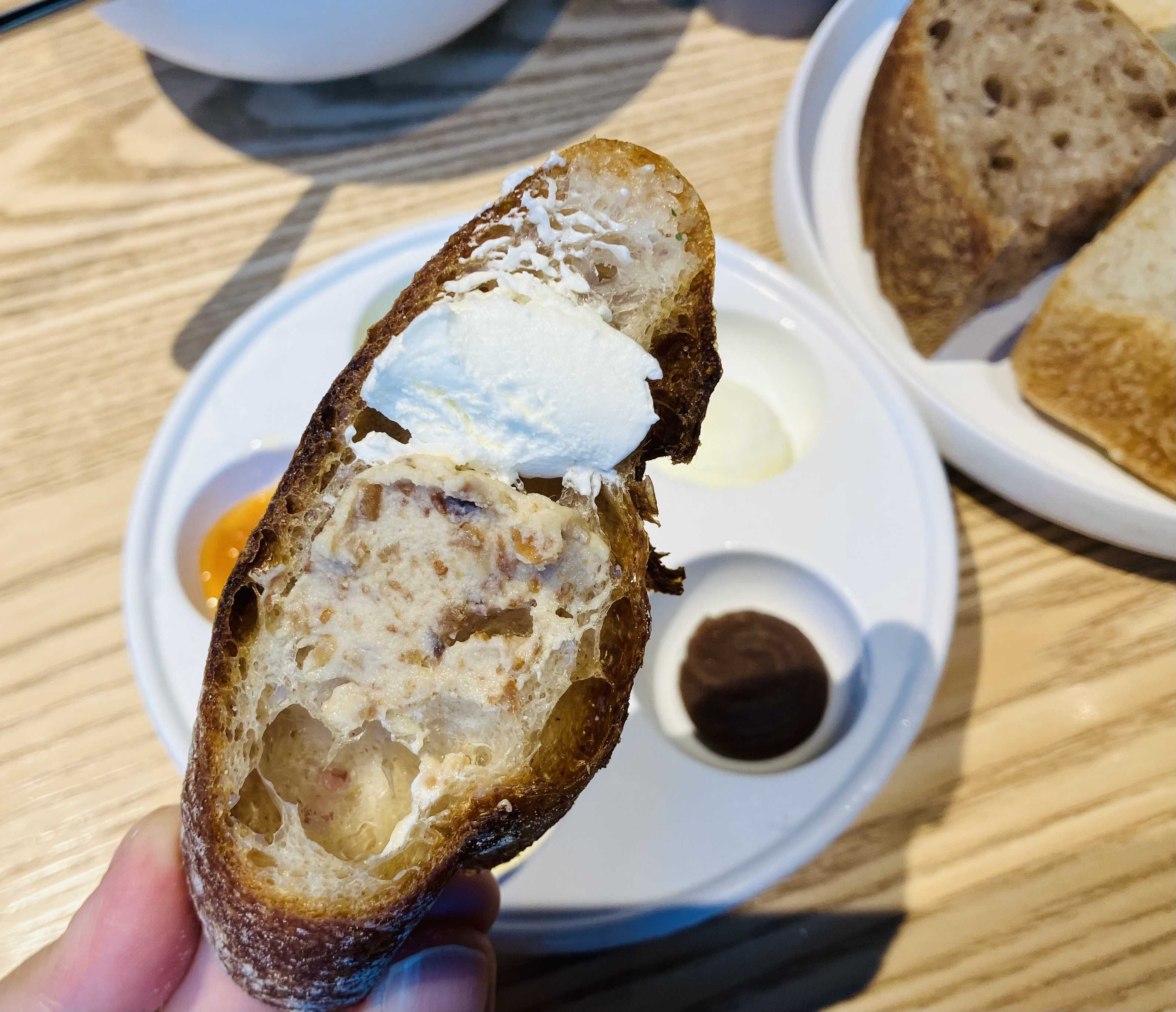ディップはオリーブオイル、ホイップバター、あんこ、ハチミツ、レーズンホイップバター、マンゴーとアプリコットのジャム。