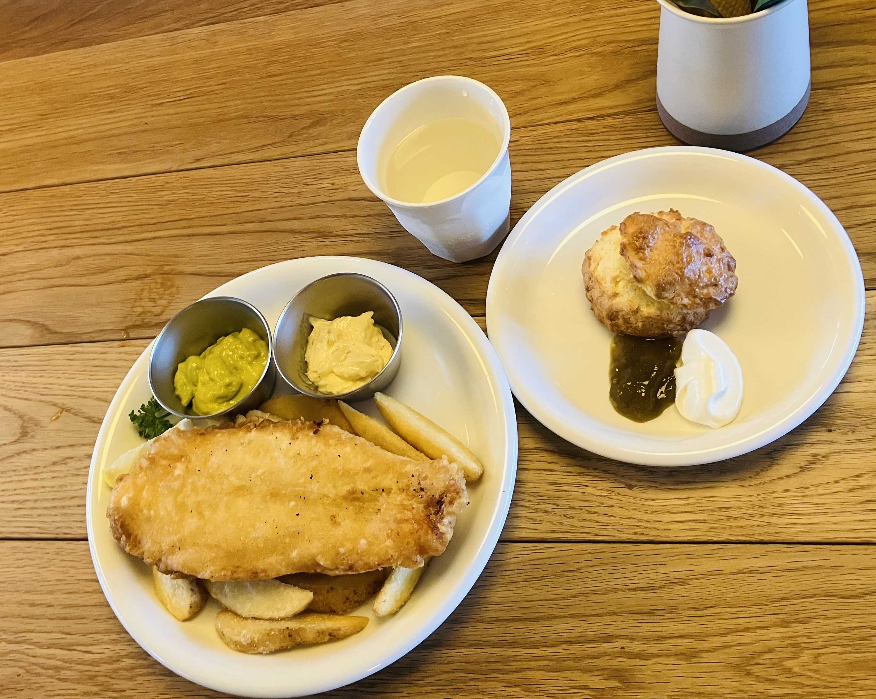 ちなみに友人は「プレートだとぶどう食べられなくなるから」とフィッシュ&チップス980円をチョイス。スコーンを追加してライトミールな気分でオーダーしたのですが。。