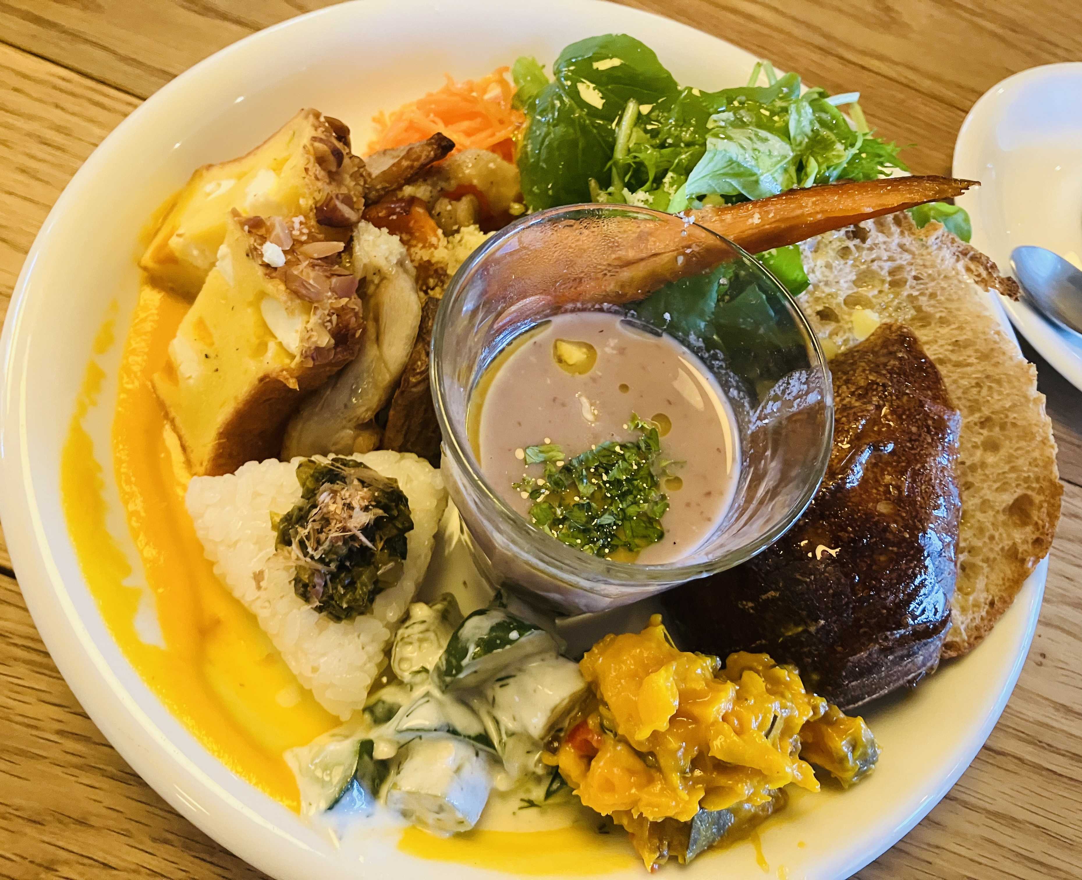 パンにおにぎり、生野菜にグリル野菜、キャロットラペやチキンソテーなどなど。