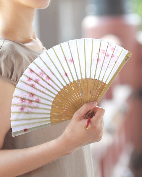 【特選!こだわり京の扇子】特選!扇子同柄(扇子袋付)「手拭いプリント/桜」ua249■京の扇子 ラインナップ ◆女性用扇子 ◆男性用扇子 ◆飾り扇子 ◆祝扇・葬儀扇特徴 涼しげな透かしのある生成り色の扇面には、シルエットのようなデザインの桜の絵柄。中骨には可愛いハートが型抜きされてい ...