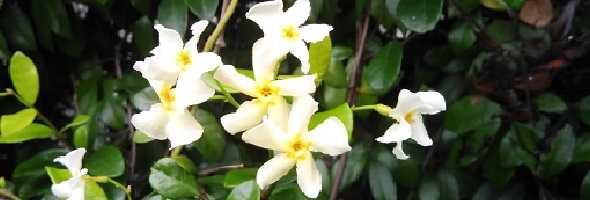 >鑓水2丁目住宅街の生け垣に絡む、「テイカカズラ」の花です。生垣の中に程良く、絡み込んで花を咲かせていました。植栽業者の手腕の成果でしょう!!