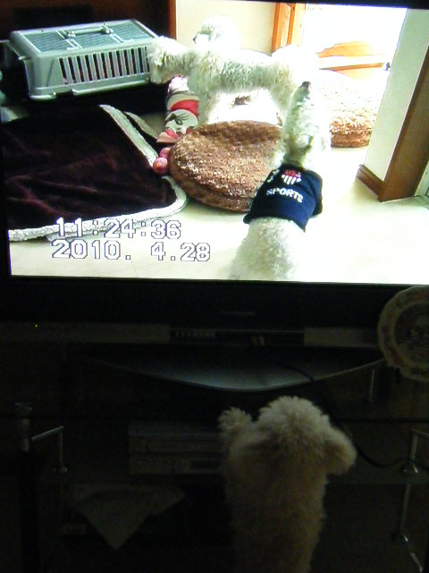 おはこんばんちわんこ!U^ェ^U!先日、お出かけする際、我が家の3プー&お預かりしているれみ 4プーの様子がどんなだか、ビデオカメラをレコして 様子を撮影しました。o(≧∀≦)o それを どんな様子だったかテレビに接続し、確認していると・・・・テレビにわんにゃんが映ると 楽しげにテレビを覗きこむせりながもう、それはそれは楽しげに 嬉しそうに見ていました。(*≧m≦*)ププッわんこが居る場所はサニタリールームの一角。トイレやお水を飲んだりと 自由に出来る空間にしています。2時間程度の外出なら ハウスさせてますが長くなるかもって時は、いつもこんな形で外出しています。 その動画はこちらです。ぽちんしてくださいね(ご注意・わんわんうるさいです。。)4プーのお留守番動画 posted by (C)serix-poo-mama★ 動画ではおうちを出てから3分くらい後。。。すでにせりなとり~ちゃんは 自分のクッション位置に坐る準備完了。。。。 しかし・・・・れみとレックスは 出て行ったお外の方向へ向かってわんわん・きゃんきゃん・・・・なくなくプーママが居る時は 膝のとりあい場所のとりあいでわんわんう~う~やってるレックスとれみ。。。こんなときだけ、息を合わせたように外へ向かって2プーで わんわん。。。(;一_一)・・・あんたら。。。もちょっと違う 心の通わせかたでけへんか???(^_^;)。。。 画像はこちらレックすは 上を向いて遠吠え状態・・・・(;一_一)・・・・外出後、30分くらいレックスとれみはわんわん。諦めたレミは自分のケージの中で 大人しくなりましたがなんと、レックスは 外出後1時間近くうろうろ うろうろ。。。。そして ようやく、仕方なしにクッションの上に座る・・・・けど。。。。なかなか寝ない・・・・(;一_一)・・・本当。。。毎回、こんなんなんだろうか???今度は れみの居ないときの様子を動画で確認せねば。。。御近所の皆様。。。騒がしくしまして申し訳ございませんでした。 暗いので明るくして撮ると・・・テレビの中のせりなはり~ちゃんで隠れています。れみは。。。。自分のケージの中に入っています。 賑やかな一週間でした。もうじき 姉が レミを迎えにきます。 お弁当ランキングに参加しています。ポチっと応援くださるととても嬉しいです!(*^_^*)!ありがとうございます!にほんブログ村プーママのお弁当ブログはこちらです 読んでくれてありがとうございます皆様にHappyが沢山訪れますように生かされている喜びに感謝!ありがとうございます