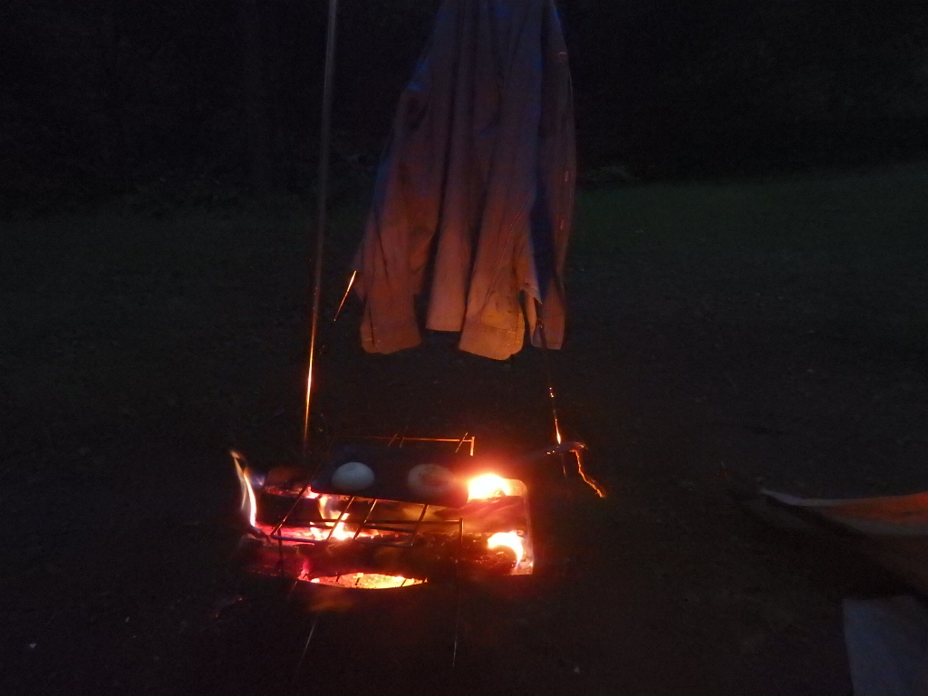 やっぱりタープを持ってくればよかったと後悔するもこれもキャンプ。水没したシャツを乾かしながらまったりと夜を過ごす。