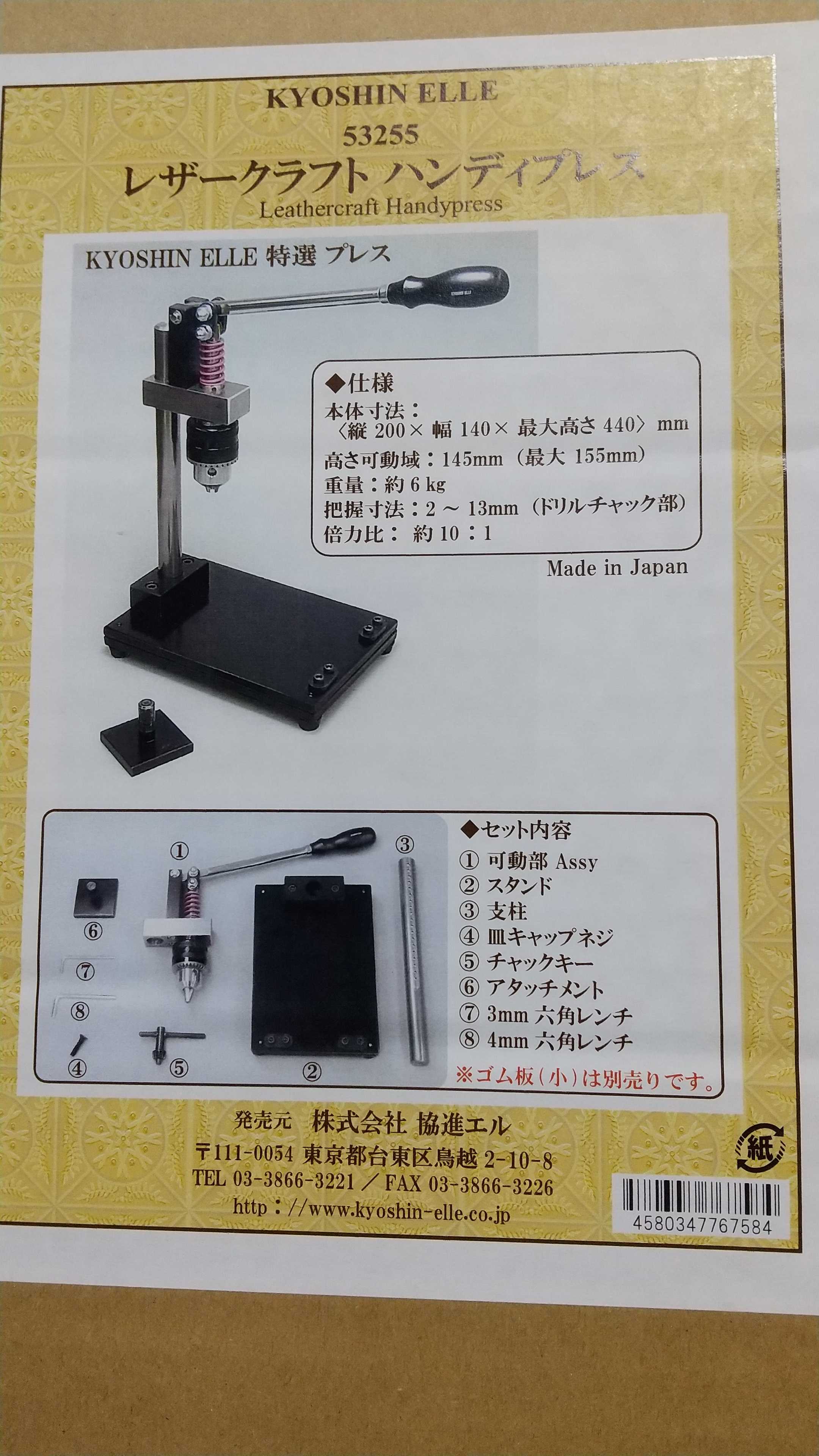 楽天のグッドレザーというお店でハンドプレスを購入しました。写真は、プレス機本体+付属品、別売のゴム板、メタルプレートです。メーカーは協進エル、商品名は「レザークラフト ハンディプレス」重くてしっかりした作りです。組み立ても簡単で、日本語の説明書に組み立て方と使い方が載っています。今作っているジーパンにリベットを付けるのに使う予定です。リベットを付ける方法は、打ち台にリベットを置いて、打ち棒を🔷木槌でたたく🔷プレス機でプレスする卓上型のプレス機の大まかな種類は、🔷ハトメやカシメ、ホック等の取り付けのみできるもの🔷上記に加えて、平目打/菱目打、刻印、パンチなど、レザークラフトにも使えるものがあります。正直、リベットやカシメを付けるだけで、頻度も多くなければ、木槌で十分だと思います。私の場合、革のリュックを作れるようになりたいと常々思っていまして、初期投資することにしました。というのは、革のバッグ等を手縫いで作るとき、あらかじめ菱目打で一つ一つ糸を通すための穴を開けるのですが、その度に木槌で打ち付けます。それだと、自分も周りもうるさいだろうし、夜中に作業できません。それで、多少高い買い物でしたけど、思い切りました。お値段、29502円です。このプレス機を買うことにした決め手は、🔷リベットやカシメの取り付けだけでなく、レザークラフトにも使える。🔷アタッチメントという付属品を使えば、工具や打ち具をプレス機に装着しなくても作業できる。🔷日本製収納場所ですが、組み立てが簡単なので、使うたびに組み立てと分解をしても良さそうですが、空いている棚があったので、今のところ組み立てたまま収納する予定です。6kgあり、かなり重たいので、上の方にはしまわないつもりです。先日、上にしまっていたカセットボンベが鼻に滑り落ちてきて、ものすごく痛かったので、これがプレス機だったら、骨が折れますね。ちなみに、鼻については、骨の折れた音がしなかったので、内出血が広がらないように、圧迫止血した後、氷で冷やしたら、ほぼ腫れもなく、当たった場所がニキビみたいに赤くなっただけですみました。レザークラフト ハンディプレス【協進エル プレス機】価格:29,502円(税込、送料無料) (2023/11/4時点)楽天で購入