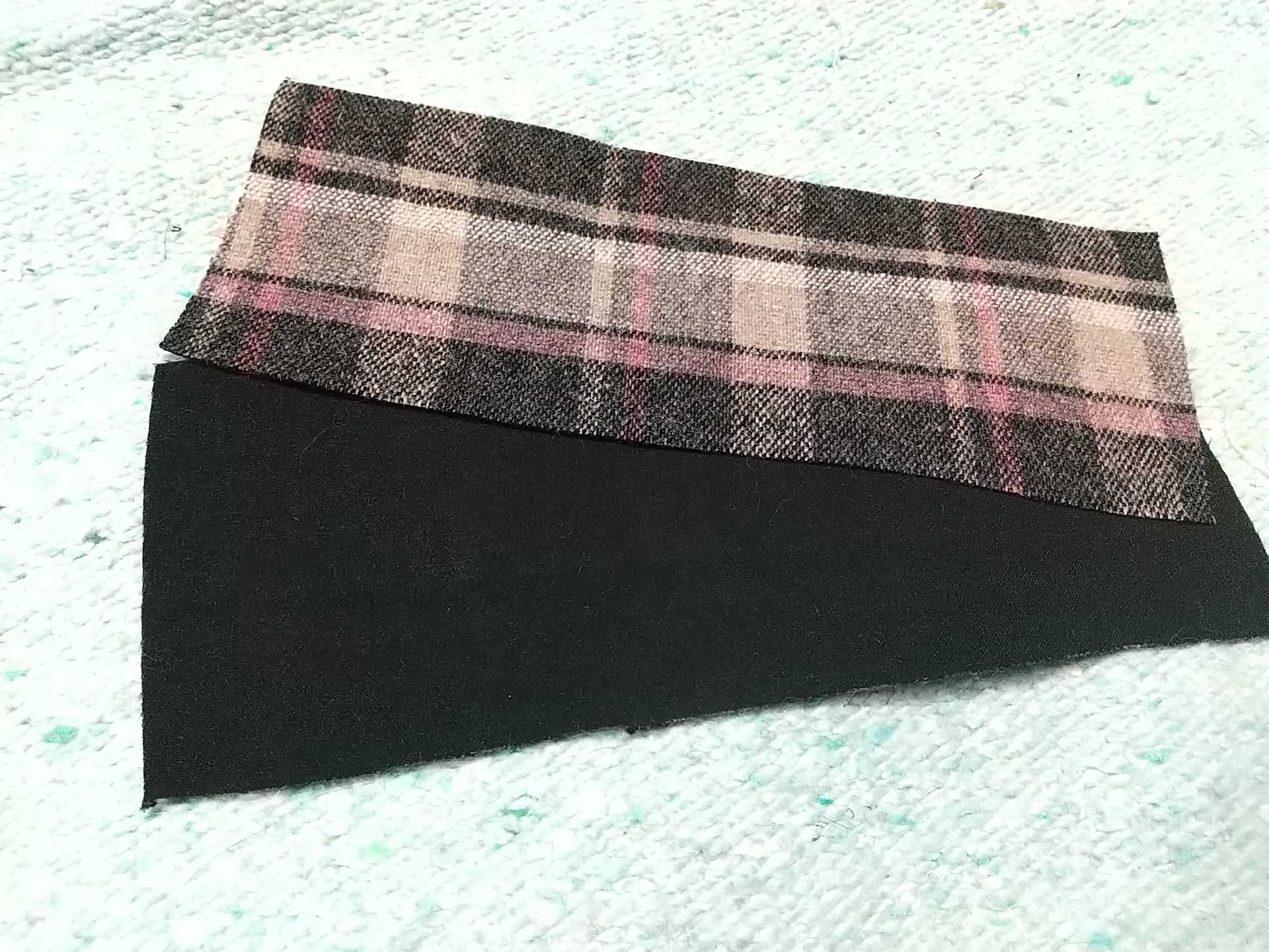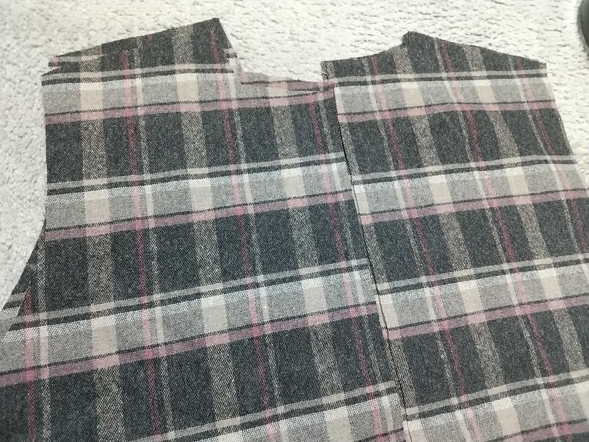 約2時間かかってようやく、前見頃のフラップポケットがつきました。まあまあ良く柄に合わせられたと思います。チェック柄のポケットは、柄に合わせたり、柄を斜め(バイアス?45°回す?)にずらしたりする方法がありますが、今回は柄に合わせてみました。フラップの後ろから、ほんのわずかに生地がはみ出してしまいました。心残りだけど、力尽きたので、このままいきます。