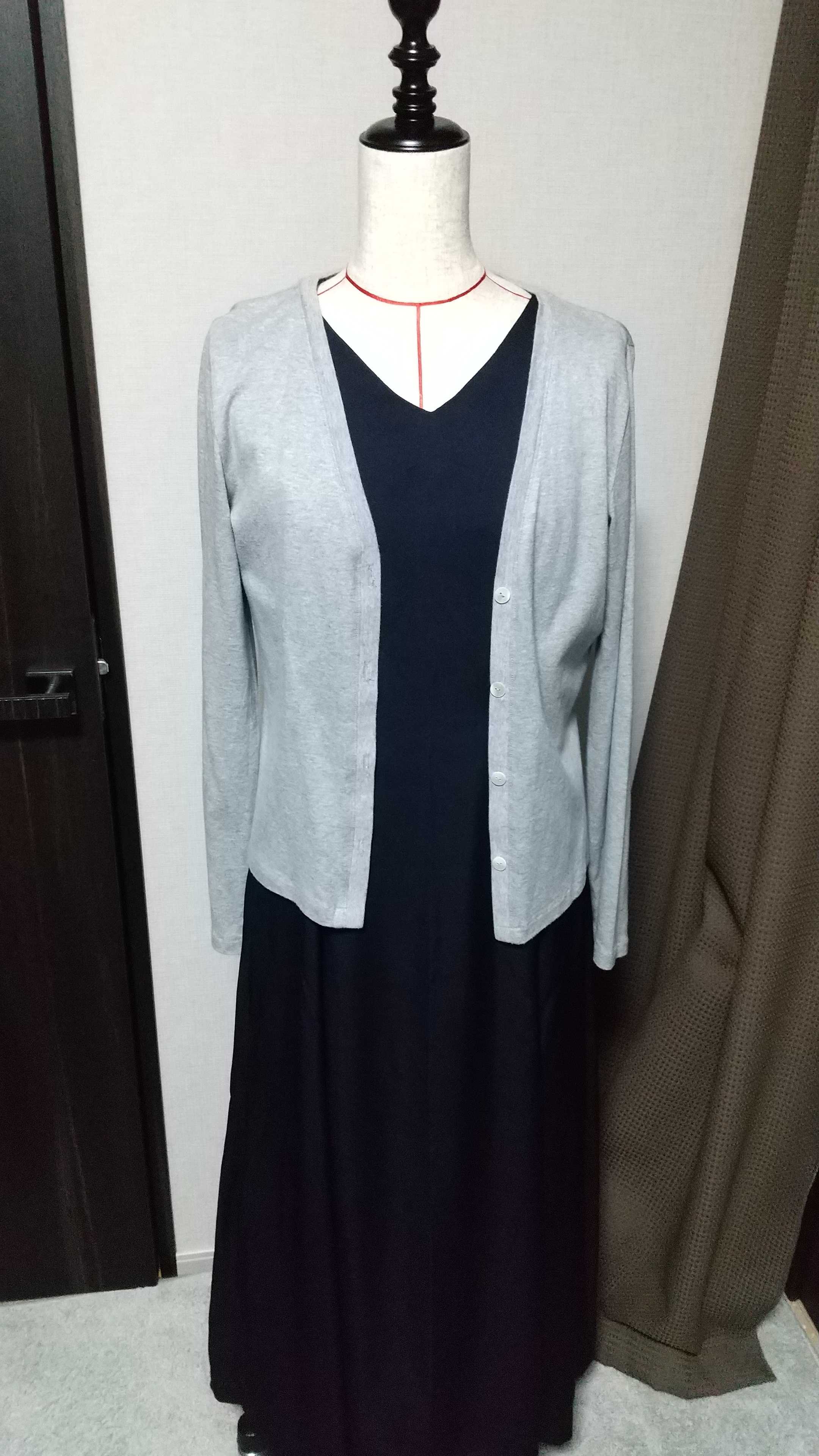 できたばかりのロングワンピースにカーディガンを合わせてみました。少しカジュアルになって、外にも着ていけるのではないでしょうか。私は、産まれるときに母のお腹の中におしゃれというものを置いてきたような人間なので、このくらい平凡で地味な洋服が着ていて落ち着きます。このグレーのカーディガンは、裁縫を始めて10ヵ月目くらいに作ったものです。型紙(ニットカーディガン)は、rick-rackというお店の通販で購入しました(楽天市場内にはないみたいです)。型紙は切り取ればすぐ使えるタイプです。この頃はミシンの操作だけで精一杯で、型紙を作る余裕がなかったので、ものすごく助かりました。付属の説明書も丁寧でわかりやすいです。裁縫を始める前は、Vネックのスタンダードな形のカーディガンって意外と探しづらかったので、自分で作れるとわかり、もう買わなくてもよくなりました。Mサイズなのですが、🔷ボタンを締めるときつい🔷袖の幅が細めなので、袖のあるインナーだと腕もきつい🔷丈はスカートには良いのですが、パンツだと短い、ということで、サイズを間違ってしまい、ほとんど着ていなかったのですが、ノースリーブワンピースであれば、今後着られそうです。材料は、🔷生地: 日暮里のトマトで1m500円ほど。綿100%ニット。1~1.5m使用🔷ボタン: 日暮里の熊谷商事で1個数十円。白蝶貝。4個使用🔷糸、接着芯合計で1000円かからなかったと思います。