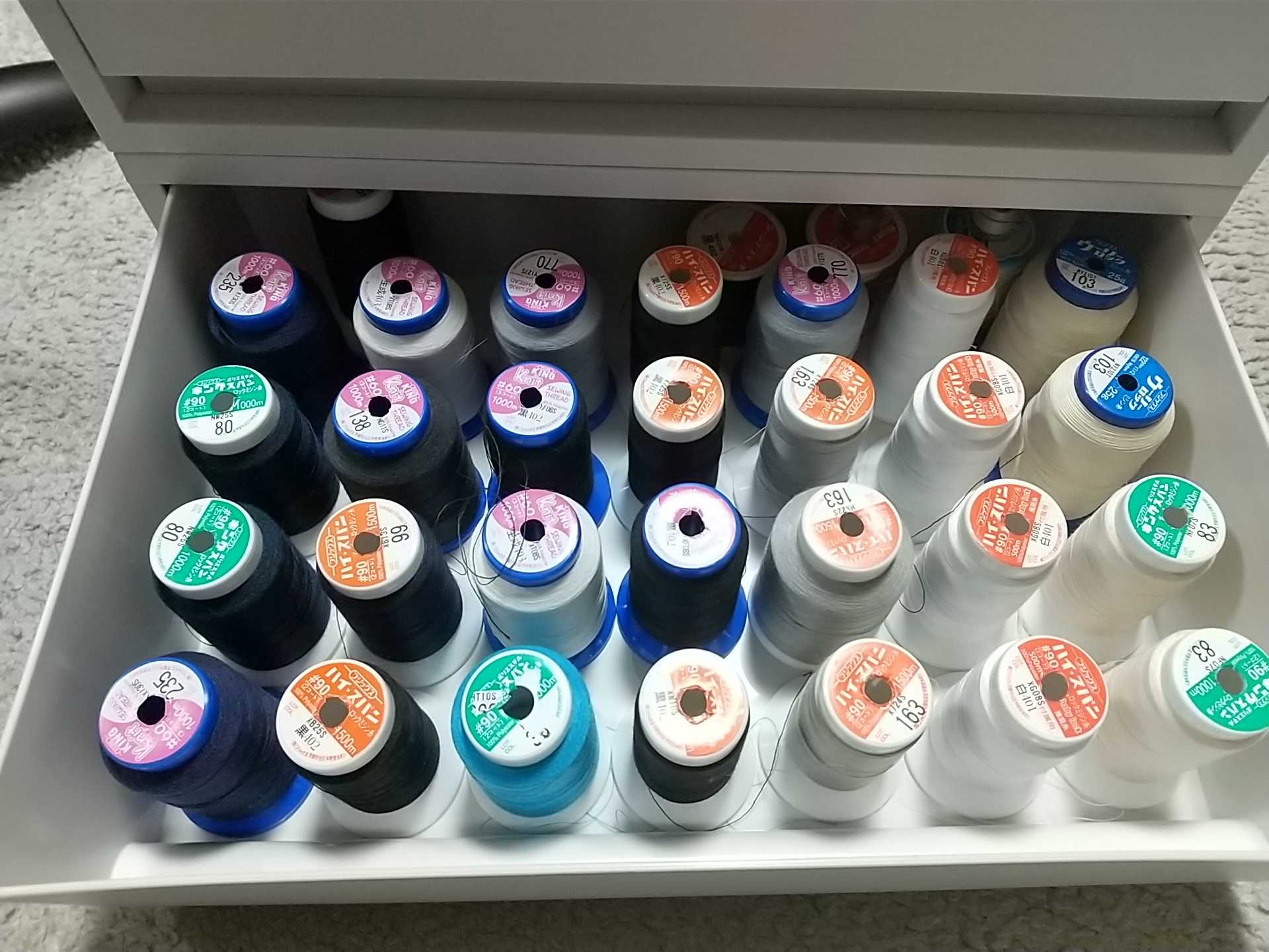 裁縫歴3年目にして、ようやく糸の収納を整えました。最初は糸の数も少なかったので、ミスターボビンで糸とボビンをまとめて、色の種類ごとにビニール袋に入れて、カゴの中に放り込んでいました。日を追うごとに、糸の数も色の種類も増えて、ごちゃごちゃになって、取り出すのも大変に。そこで収納方法をネットで調べてみると、大きく分類して、🔷見せる収納 or 見せない収納🔷糸を横に寝かせる or 立てる🔷ボビンと一緒 or 別々私の場合、🔷掃除や飾り方に自信がない⇒見せない収納🔷糸番号で使う糸を決めたい⇒立てる収納🔷ボビンがすぐ迷子になる⇒ボビンと一緒の収納ということで、いろいろ探して、無印良品のポリプロピレンケース・横ワイド・薄型・引出し式にしました。引出しの内側の高さが5.5cmで、糸とボビンをくっつけた高さにぴったりでした。1段に7×11=77個の糸が入ります。ただ、ロックミシンの糸、700mの大きなシャッペスパン+ボビンの組合せは入らないので要注意です。[11/20.21 15周年祭感謝クーポン有]ボビン収納 ミスターボビン ピンク・ブルー・イエロー・3色セット 大容量もあります 上糸と下糸をセットで収納 便利商品【無印良品 公式】ポリプロピレンケース引出式・横ワイド・薄型 幅37×奥行26×高さ9cm価格:1,290円(税込、送料別) (2023/11/20時点)楽天で購入