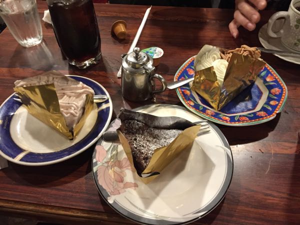 王様とストロベリー は、スイーツを中心とした不思議な喫茶空間。 例えば、写真のケーキセットは、飲み物とセットで1人500円! 下の写真は、KINGパフェ 2800円が運ばれて行く図。 高さ70センチぐらいあります!
