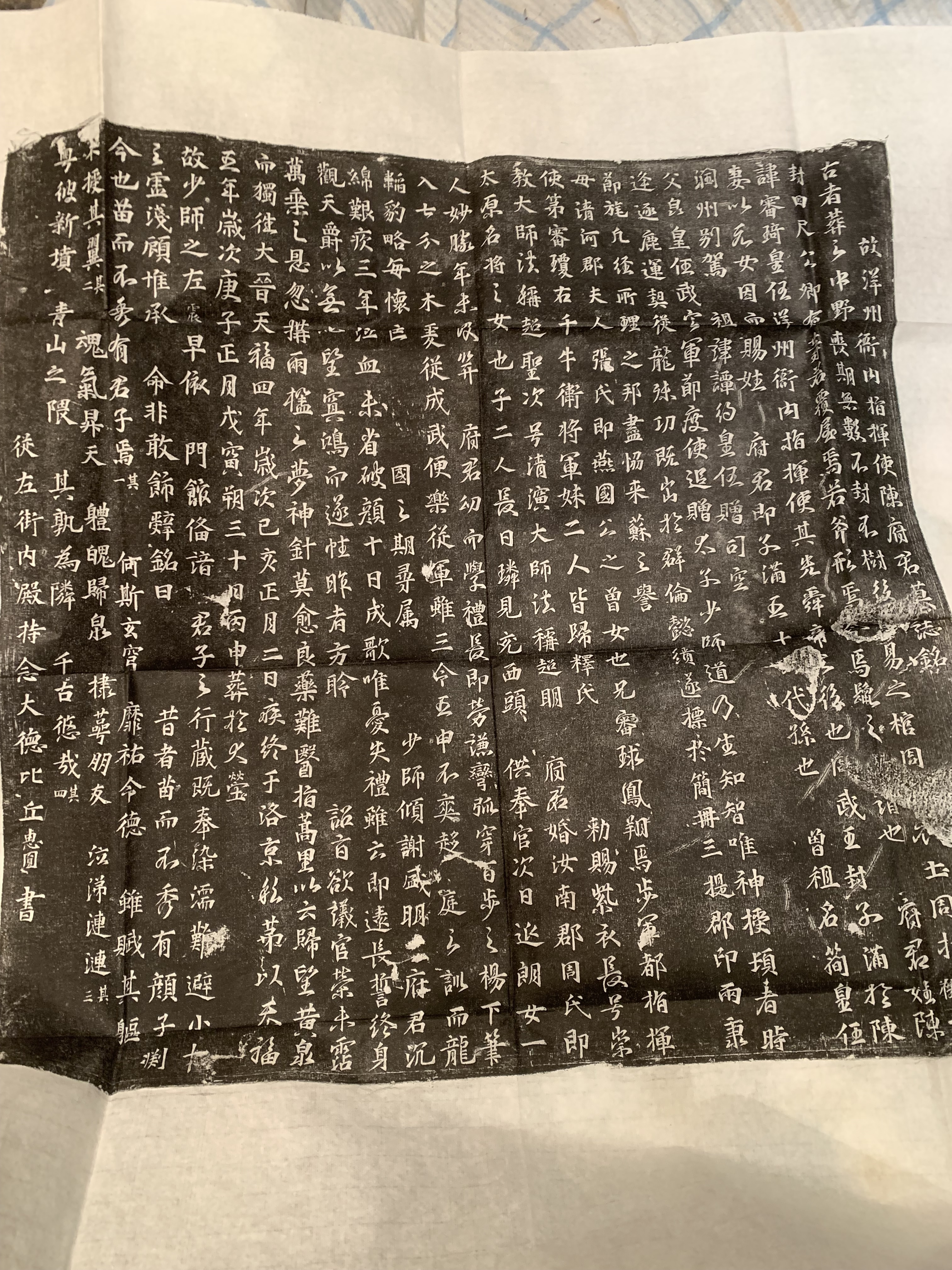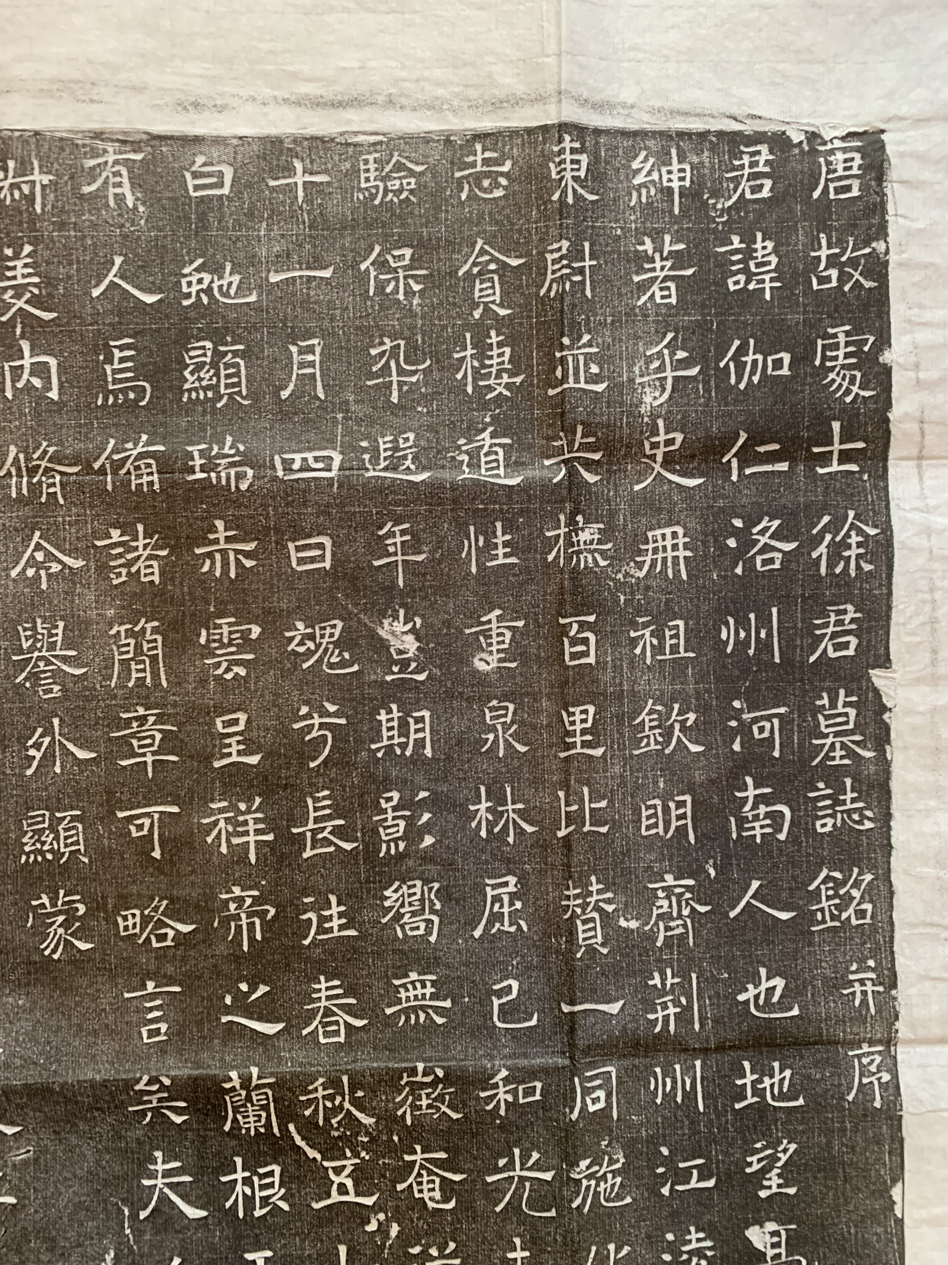 謎の墓誌銘ではあるが、文字は隷書混じりでかなり卓越しているように思う。文字を読める人は1400年前の唐時代に100人に1人居なかっただろう。いや1000人に1人かもしれない。それならば、文字を書ける人は3000人に1人か5000人に1人かもしれない。文字は、正にタイムマシンの機能を有している。1400年後の現代の日本でも何となくこの墓誌銘の意味が分かる。これは奇跡だと思う。この人物は、徐という姓で、諱は伽仁となっている。唐故、零士 と書いてあるかと思ったら、似ているが處士ですと教えて下さった方がいた。零に似た字は処の旧字体の「處」とのこと。宮仕えまではしていない民間人で自宅から官吏として通っていた人という感じらしい。。こういう解明されていく過程も拓本の楽しみかもしれない。永徽三年に亡くなったような事が読み取れるので652年に亡くなったのかもしれない。この先、詳しく調べていく。