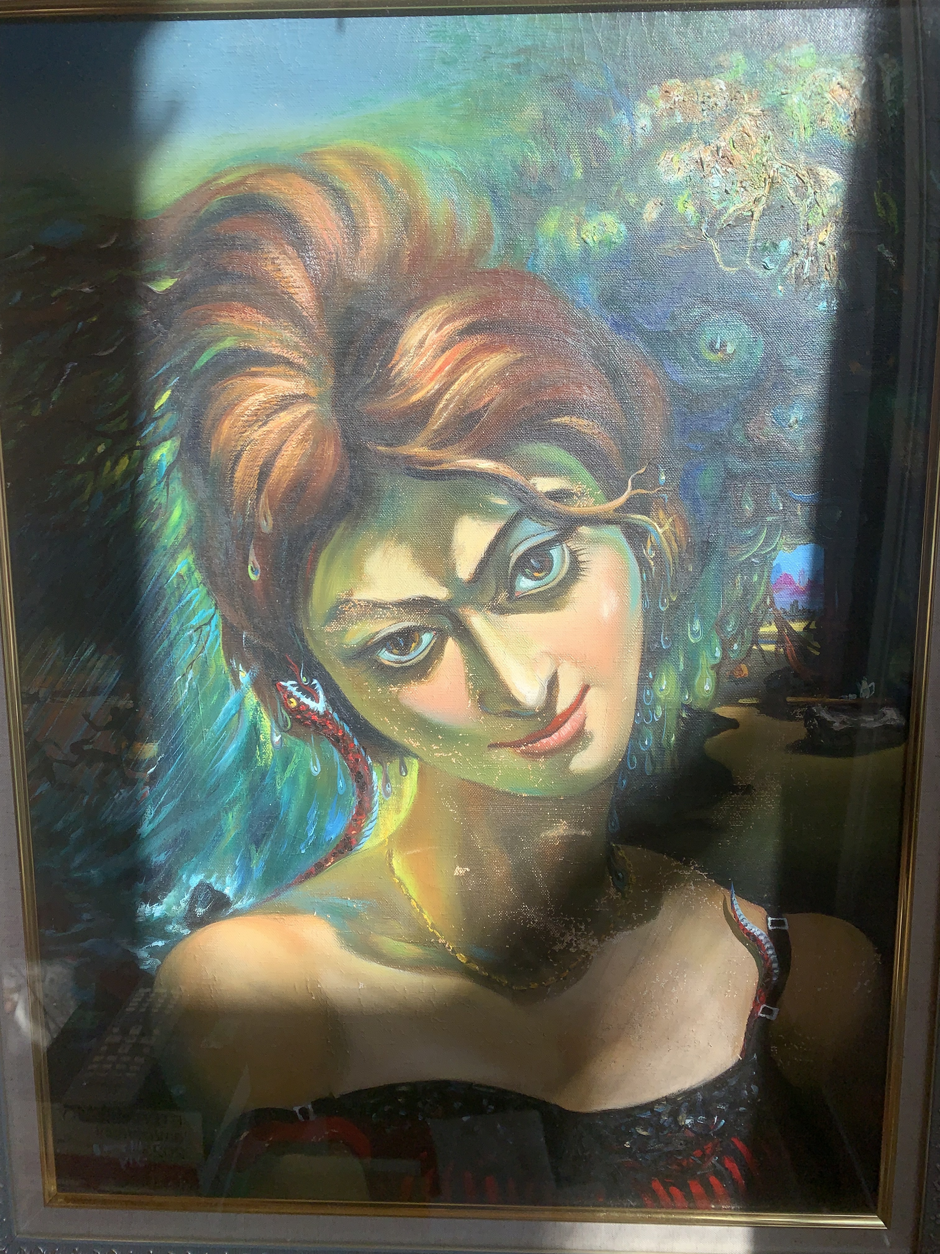私の宝物である。1960年に描かれたシュールレアリズム油彩画。女性の右耳近くに蛇の頭があるが、この蛇の尻尾は女性の左肩に見える。女性の髪の毛の先は樹木になりその先から水が湧き出ている。今から64年も昔の絵とは思えない斬新さ。