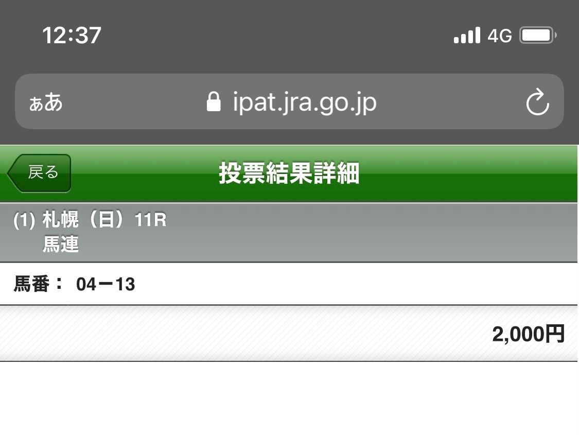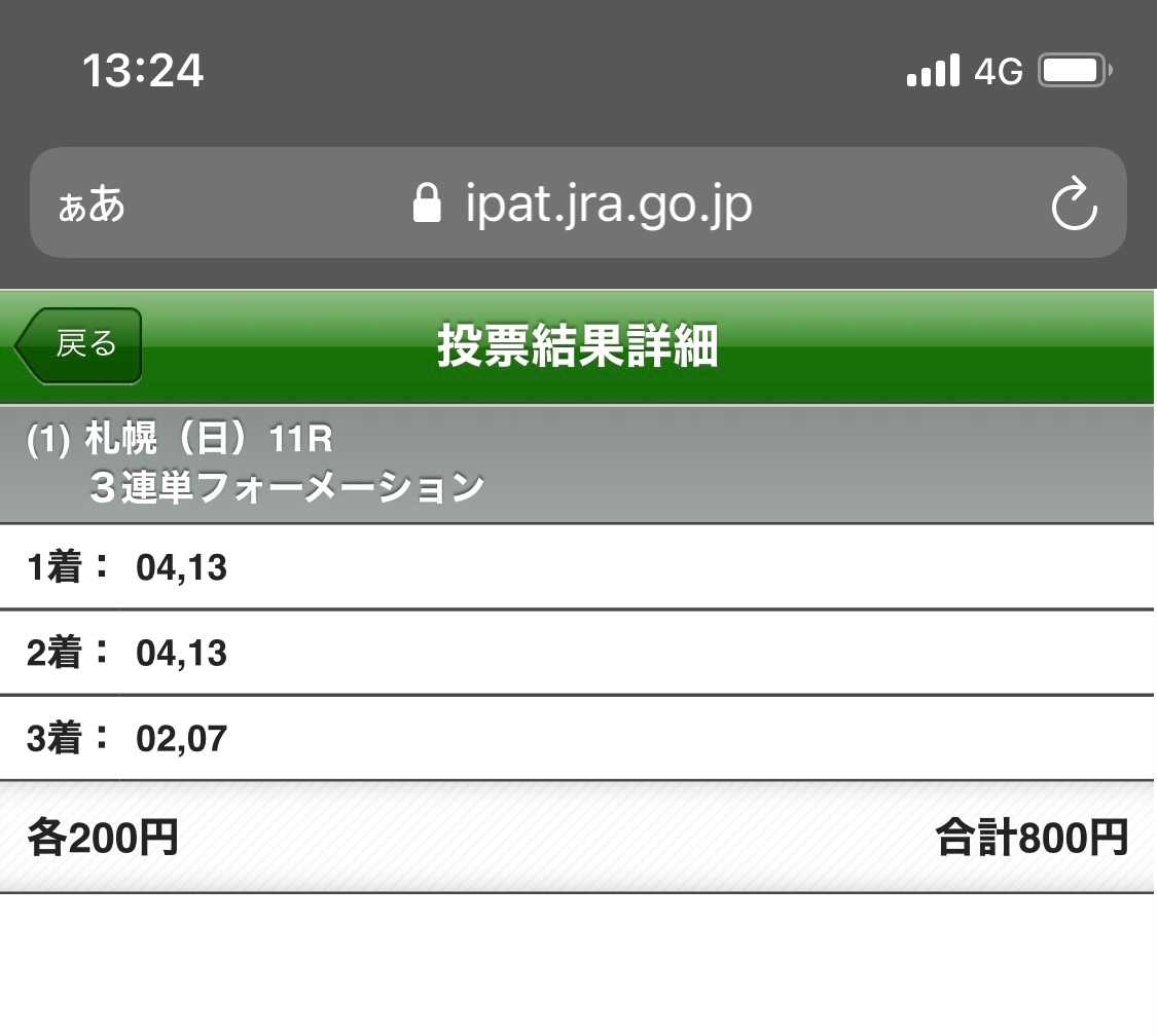 札幌メインは馬連堅い馬券と思いついでに去年2着のペルシアンナイトを3着に入れた遊び馬券まで的中。