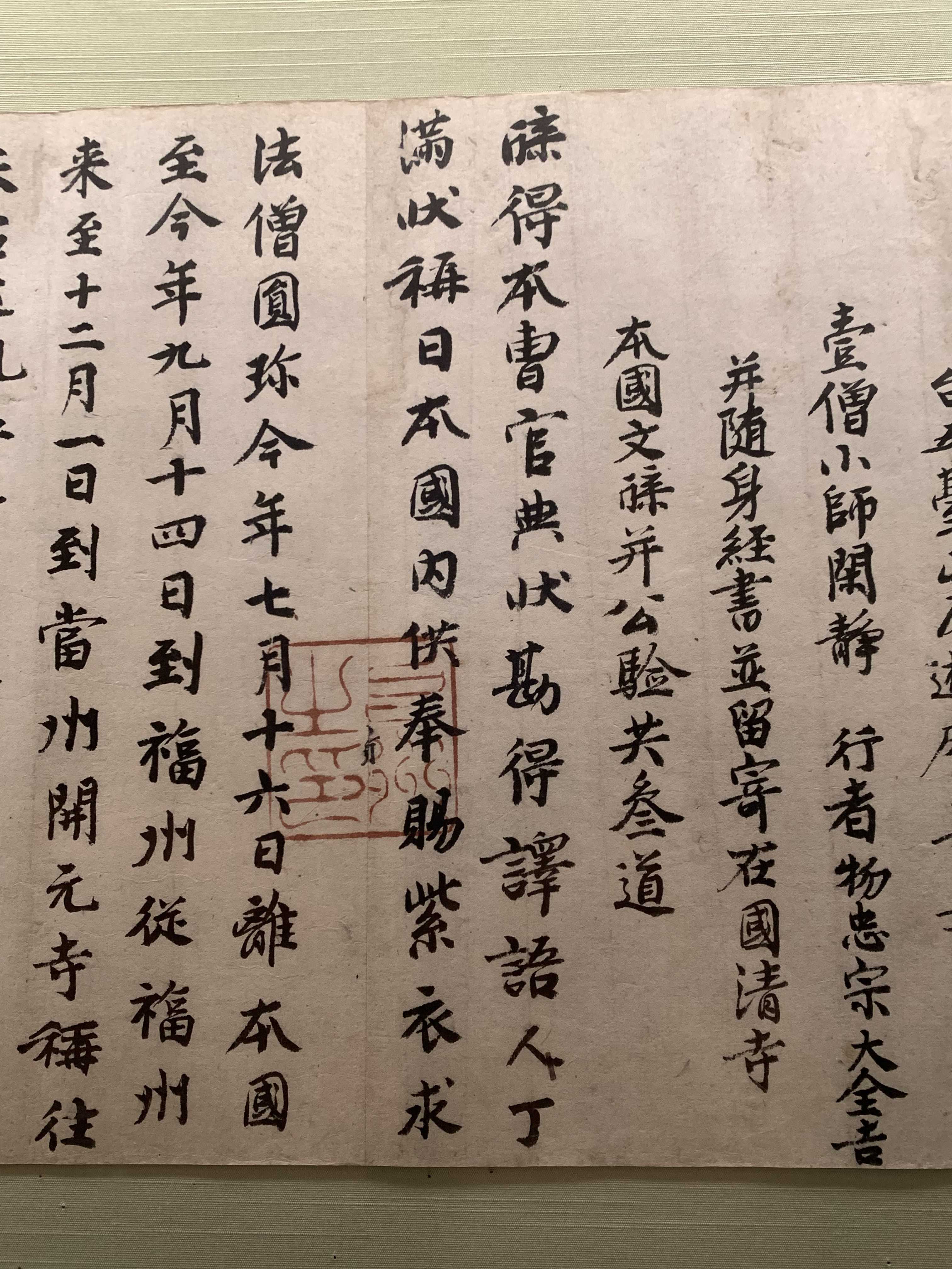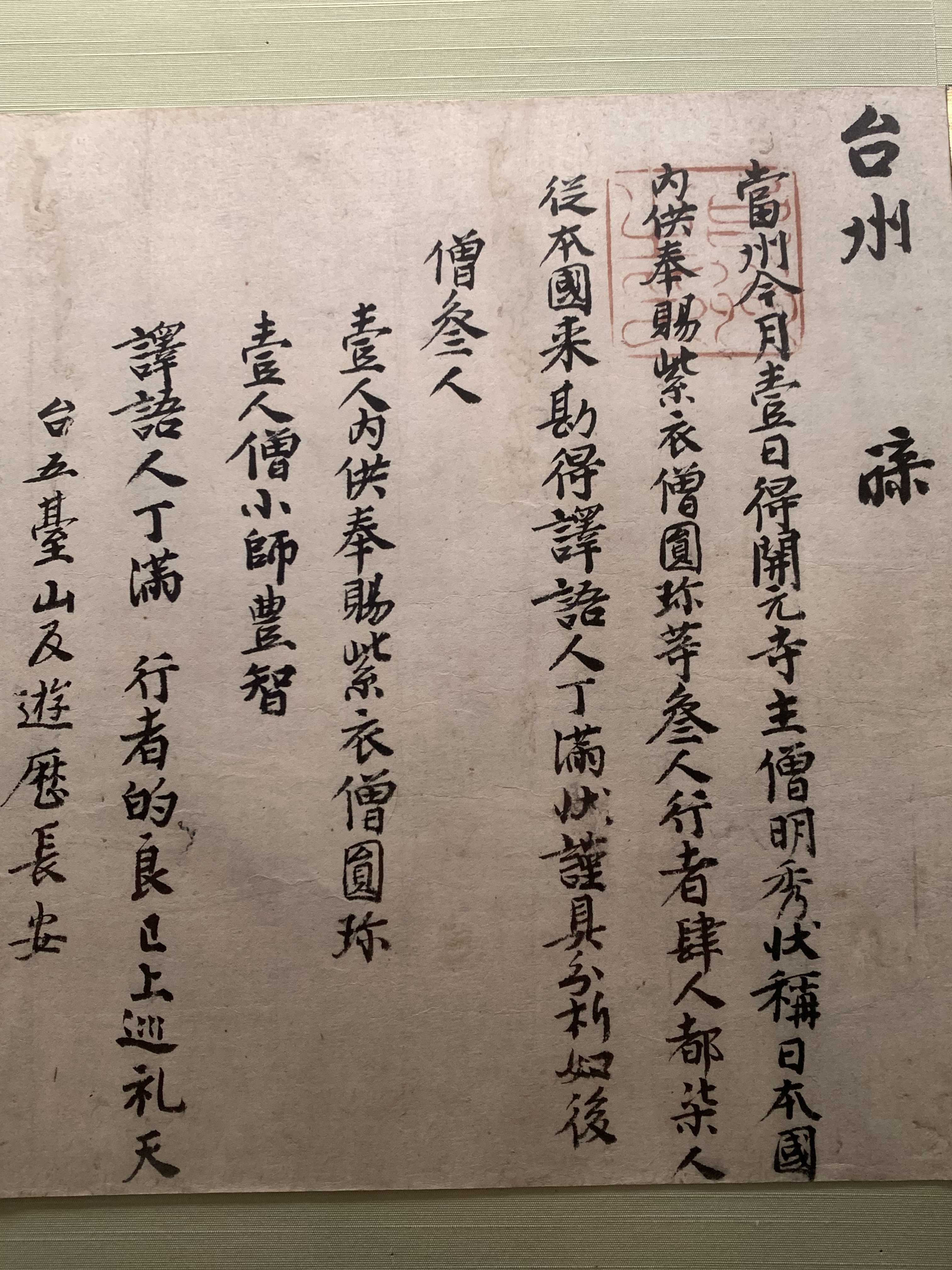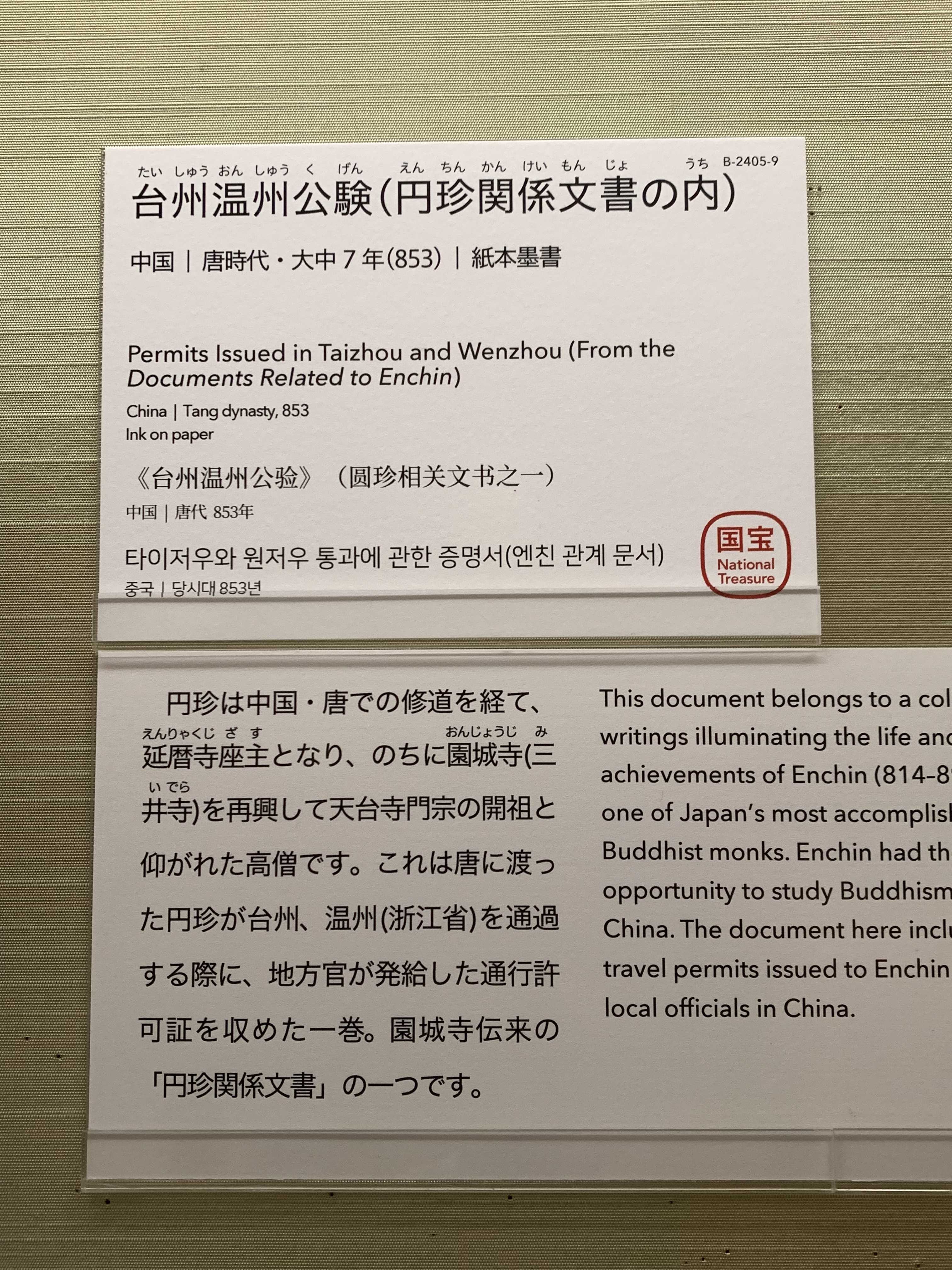 この古文書は、円珍と従者2名の計3名が現在の浙江省を通過する際に官吏が発行した通行手形である。円珍が日本を離れ福州に至り、開元寺で学び、長安に遊学に行くみたいな事が書かれている。国宝! 凄すぎる!