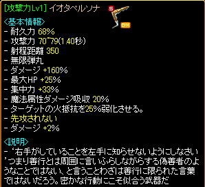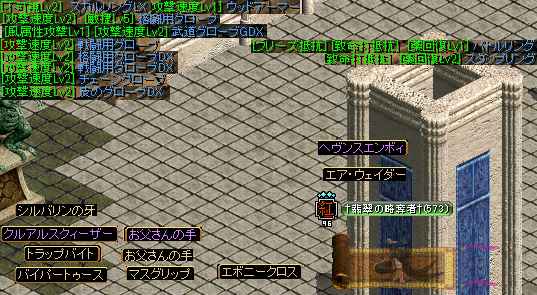 さあLvが580になりました580となると本来なら装備って結構いいものですよね^^;引退していった先人今もがんばっている同職のかた普通はこんなレベルになればそれ相当の装備になってます( ・ω・)とくに引退された先人などは400ぐらいで神ってたぐらいなものです( ・ω・)んじゃ俺はというと・・・Gv装備のせていきますまあ最近やってるパターンということで攻速重視KO60%装備とKO93%装備を・武器まあ最近かったこれをそのまま・・・てか戦闘ダートUMと秒間ダメさほどかわらないのが理由ですまあぶっちゃけ入れ替えるのめんどくさいしヘ(゚∀゚ヘ)・首(攻速KO60%装備とKO93%装備)まあはたからみればくだらない装備ともとれるんですが^^;KO装備そろえ始める発端となったのは↓のピエンですこれ呪い抵抗のおかげで指をいじくれるようになったし↑のやつは結構安くうってたし、赤ダメ考えなくていいので買いました攻速首はいつか何かの異次元にかけてみたいところ・・・攻速KOジェノか思い切って攻速HPKO首の3OP異次元とかさできたら神だろうな~まあそんな余裕ができる日がやってくるかどうか^^;・頭あたらないと意味ないのでいつも常時つけてますまあこれつけてもあたらない方がいるのですが・・・いつか確実にあてるようにすることを目標にしてます・背いたって普通な背・・・もうちょいましな背を買わないとHPKO背がうってあったので買おうとおもったのだけれども商談する前にきえてしまいました・・・無念・・・・腰自分の中ではお気に入りの装備のひとつです(・∀・)異次元して作ったものだからなおさら愛着あります。まああまり人気のあるものでもないんですが・手はい、またでてきましたしょぼい装備^^;以前拾ったものいまだにつかってます^^;;;;;攻速バターであればと・・・あのバター消えてもう半年たつでしょうか。。。・鎧まあシフなら当然もっときたい装備ですね当時850Mで買いました今かおうとおもったら絶対無理^^;・足異次元で初めての成功品です補正3なのが残念だけどモウマンタイ!指は・・・パート2に続く^^