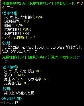 ちょっとやってみたい異次元あったので今日ためしにやってみたw↓素材はこちらもうちょいましなものをやれよとつっこむ方はご自由に^^;;;;;;えっととりあえず自分としてはHP水抵抗オーラ失敗してもHPオーラかHP水抵抗背になってほしいなってことでやってみました。検証部分てのは異次元する際OP順を緑部分のOP名の順番を重視するのかそれとも基本情報内のOP順を重視するのかということ確かめてみたかっただけです。まあ自分の予想ではHP水抵抗が一緒につくことなくどっちかが消えるだろうつまり基本情報内を重視するという予想をたててやってみました。したらばの異次元結果報告スレにもそんなこと書いてあったし。ちなみに左にオーラを右にHP背をいれてやりました。異次元した結果・・・まあ玉砕OTL見た感じ全OP基本情報内のOP順ごとにランダムで選ばれてるみたいなのでやはり異次元するときのOP順は基本情報内のOP順が重視されるってことでいいのかな?まあまたやったときに例外でてくるかもしれないけど。フリーページに最近やった2つの異次元の結果かねて異次元結果のせるページでもつくって記録でもしてみようとおもいます。さてお金も吹っ飛んだしまた金集めに奔走せねばwでわノッシッシ^^