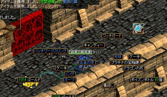 遺跡秘密うまいね~毎日Lvあがるしこれは楽だ。一日だけ0時に参加できなかったので2回ほどソロで遺跡いってます。ブービーのスタンと分身、油ドーピングでの花ダブスロでなんとか時間かければクリアできます。1回目は2回死んだせいで16Mも出費しちゃったけど・・・2回目は死なずにクリアできました。これは2回目の画像なんでみてくれればわかるとおもいますがデーモンキングを部屋からだしてやってます。こうしないとゴースト沸いて集中砲火うけちゃうんで死んじゃうwまあこまめにブービーはってればまず攻撃はくらいません。2回で80Mってのもうれしいですがポタだしにまず時間がかからないというのもうれしいね。GMから許可は得たのでGv結果をはりやす。3月9日G☆stars戦(クロカン)3月11日BLACK WIDOW戦(蛇目)最近は圧倒的に勝つか、BW戦みたいにぼろ負けしちゃうかのどっちかってのが多いかな。人数とそのうちの火力の多さがどっちの戦いにおいても影響してたとおもう。G☆のときは紅のほうが人も火力も多く、BWのときはBWのほうがPTも火力も多かった。BWの場合はまあそれだけではないけれど。昔のBWは某TOP剣士さんが火力のキーというイメージだったけど今はそうじゃない。BWの人それぞれがうまく動いてるし、火力の層もかなり厚い。倒せる人をまず確実に落としてるからなかなか体制を立て直すこともできませんでした。実際某TOP剣士さんいなくてこの状況だしね。レクイエムもうまく利用されてたみたいです。詳しい話は反省会のときにネットがダウンしてたせいで聞けなかったのでできないですが。個人の反省としては体制をくずされっぱなしのときにどう動いてるかということでしょうか。正直うまく動いてなかったし、実際どうしていいかもわからなかったし。適当にWIZやBISに飛びついては払い蹴りしてたくらいでしたし。まあ難しいところかな。最後にドロップ記録でノシ^^;相変わらず牙Uめが・・・まあ手がよかったからいいかな。今使ってる手より攻撃力高いのでこっちにチェンジします^^
