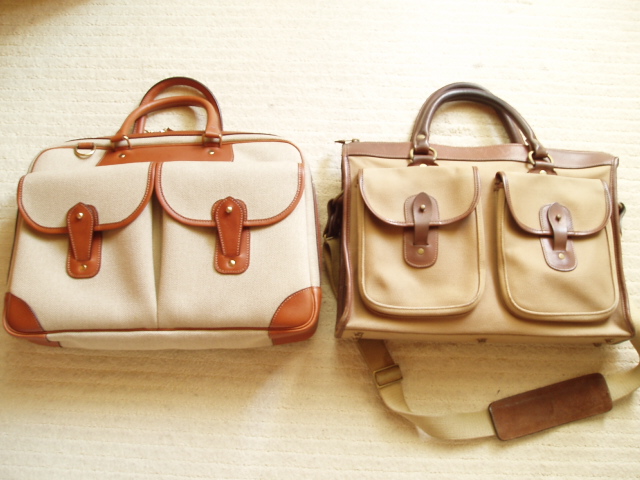 グルカNo.5と、万双のイタリー生地の実物を並べて比べてみる。万双のほうが、グルカより少しデザインがフォーマル寄りか?個人的にはカジュアル系のほうが好きなので、グルカのほうがデザイン的には好き。といっても、気にするほどの差じゃないけど。だって、万双のバッグを気に入って買ったわけだから品質を比べてみると、どちらも生地はしっかりしてるし、縫製もしっかりしてる。材質は当然違うが、どちらもいい仕上げになっている。で、グルカに比べて万双のほうが良いところは、内側の収納ポケットがたくさんあること。ポケットや仕切りが適度にあり、これはバッグとしてとても便利。グルカは小さなポケットが3つあるだけ。(写真に撮ってないけど、ショップなどで確認して)きっと、グルカは別売りの収納ケースを買わせるつもりだろう。さらに、万双はグルカより軽い。これ重要。正直、グルカは重くて、紙資料やパソコンを入れると、かなり重くなり、ウエイトトレーニングしていると思ったほど。それに比べたら、万双は軽いからいい。ただし、グルカは10年使って写真のような状態というのはかなり高品質だということが分かる。型くずれ、全くなし。万双は今回初めて使用してみるので、耐久性に関しては未知数。数年使用してみないと判断できない。一方のグルカは、確実に耐久性は抜群である。と、スペックを比較してみたが、それぞれの価格はというと・・・万双のイタリー生地 天ファスナー(外ポケット付)は約38000円。一方のグルカのNo.5は、メーカーのネットショップで約800ドル。もう一回り大きいサイズのNo.17 SATCHEL だと約900ドル。グルカ、高すぎ。さらに、日本では直販していなから、アメリカのメーカー直営ショップで購入するしかない。商品代に加えて、送料が5000円近くもかかる。日本の並行輸入ショップでも売っているが、No.5が105,000円もする。グルカ、高すぎ。正直、10万円も出してキャンパス生地のバッグを買う価値、あるのかと悩むところである。・・・・グルカvs万双企画、まだまだ続けます。続きは後日。