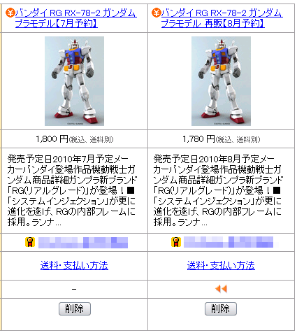 こういうことがあるんだ…同じショップの同じ商品なんですが、なぜか初版予約と再版予約で値段が20円違います。単なる凡ミスだとも考えられますが、しかしそもそも発売前から再販の予約を取ってるのが不思議です。これは、初版はすでに各店の割り当て分が決まってしまっていて追加注文ができないということ?するともしかして値段の違いは初版に予約を集中させないための工夫なのか…!?うーむ……昔のガンプラブームの比ではないにせよ、やはり只者ではないな、ガンダム!RG 1/144 RX-78-2 ガンダム【楽天市場】バンダイ RG RX-78-2 ガンダム プラモデル【7月予約】/でじたみん 楽天市場店【30%OFF!】RG 1/144 RX-78-2 ガンダム(ホビー) (2010年7月発売) ※お1人様1点限り/ハピネット・オンラインRG(リアルグレード) 1/144 機動戦士ガンダム RX-78-2ガンダム プラモデル[バンダイ]《予約商品07月発売》/あみあみ