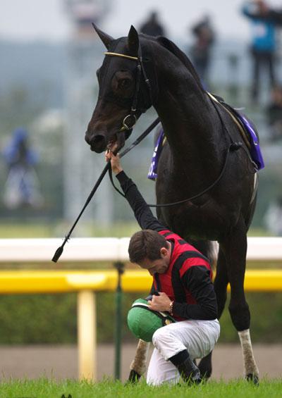 2012年10月28日、東京競馬場。天皇皇后両陛下に最敬礼をするミルコ。ステキです。ダービー馬のエイシンフラッシュを2年5ヶ月ぶりの優勝にエスコート。見事な騎乗でした。