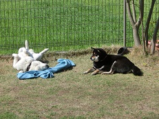 昨日のナツマリ。春の長雨も昨日は小休止だった様です。待ちに待ったお日様とお得意のポーズで久々にご対面のナツ坊。ご満悦の様子です。(笑)天気にも恵まれ、外は春爛漫の様相です。気持ちいいものです。ツツジの花が咲き始めました!春はいいですね。所用先から戻る道すがら、サクラに会いに行きました。今シーズンの展覧会への出陳を終えて日常に戻ったサクラ。後半戦は妹のスズにバトンタッチです。サクラママさんの御話によるとサクラは我が家のドッグ・ランよりも高いこのフェンスを越えて外へ飛び出してしまうことがあるそうで、早速、脱走対策の追加柵がフェンスの上には設置されていました。確かにナツマリのもとへと遊びにやってきた際もその運動能力にポテンシャルの高さを感じることがあります。誰に似たのかな??お父ちゃんの風丸かな??昼下がりの庭にこの日もスズメがやって来ました。庭に落ちているナツの白い毛を探しにやって来たのかな?日が傾いてもナツはお日様と対話中です。(笑)「やれやれ、ナツは何が楽しいのかしら?」マリのそんなボヤキが聞こえてきそうです。(笑)