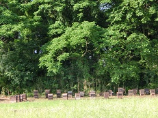 朝の散歩風景。こちらはコース途中の森に春先に設置されたミツバチの巣箱。この巣箱で営巣する日本ミツバチは比較的温厚な性質と言われています。最近、巣箱に集まる日本ミツバチの数が激減したとか巣箱から姿を消したといった不可解な現象が起きているといったニュースが流れていたことを思い出します。森を抜けると、こないだ一番茶の茶摘みが終わった茶畑へとやって来ました。今年も新茶の美味しい季節が巡って来ました。散歩から戻ると今朝もトラがナツマリに会いに来てくれました。その後、程なくして今日はハッピーも昨日に続いて遊びに来てくれました。到着してフェンス越しにナツマリへ挨拶に向かうハッピー。「おい、ハッピー。ボクのこと忘れてないかい!」そんな様子でハッピーを呼ぶトラ坊に「あれっ、トラ、いたの??」そんな面持ちで応えるハッピー。ここ最近、間近でハッピーを見ていませんでしたが、何だかまたひと回り体が大きくなった様な気がします。やんちゃ坊のトラと、まだ時折お転婆ぶりを垣間見せるハッピーが遊びに来てくれてワイワイ賑やかで楽しい朝のひと時となりました。こちらは2匹が帰った後のナツ坊。定位置の木陰でのんびりと朝食後のまったりタイムを過ごしている様です。先程のミツバチの御話との関連性はないかもしれませんが、少し前に、某TV番組で鴨川に生息する天然記念物のオオサンショウウオが絶滅の危機に瀕しているといった特集を見たことがあります。原因は食料用に日本に持ち込まれた獰猛な中国産と穏やかな性質の日本産とのハイブリッド化が急速に進んでいる事によるそうです。鴨川で捕獲してDNAチェックしたところ9割以上がハイブリッド化しているといったデータが出ているということで事態はかなり深刻の様です。人的要因でこうした状況に陥っていることを考えると、日本犬の保存といった考え方と同様に、我が国の風土の中で長い年月を経て培われてきた本質は、姿かたちは似ていても海外のそれとは全く非なるものであることを理解し、生態系の維持とその種の保存に努める義務が文明の利器を手にした私たちにはある様にも思えてきます。