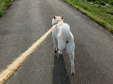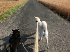 朝の散歩風景。麦畑が広がるいつもの散歩コースを今日もハイペースで進んでいくナツマリ。ナツはもうすぐ5歳になるね。換毛真っ只中のマリ。今年もビックリする程、よく抜けてます。コース終盤に今朝はリンに会いました。(嬉)思いがけずやって来たお父ちゃんとお母ちゃんに大喜びです。ちび子の頃からリンは楽しいことが大好きだったもんね。そんな娘に・・・マリ母ちゃんも、そしてシロ親父のナツもいまだに手を焼いてるみたいです。そんな賑やかな親子の様子を見て今朝はスクールバス待ちの高校生の子たちも3匹のもとへと集まって来てくれました。息子のトラもそうですが、時としてこうしていろんな方たちに可愛がって頂くことがあったりとホント有難いと思える朝のひとコマとなりました。こちらは夕方の散歩風景。この田舎町では今年も麦の収穫も始まり、ところどころ野焼きの風景が顔を覗かせる季節がやって来ました。今日は日中の気温もグングン上がって午後には32℃超えを記録し、今年初の真夏日となりました。昼過ぎに屋外で作業をしていましたが、痛いくらいの陽射しとむせ返る様な暑さが、さすがに堪えます。これまで木陰で昼寝をして過ごしていたナツマリも今日は部屋裏のコンクリの上に昼寝場所を変えて涼んでいた様です。予報では明日も真夏日。運動会に向けて予行練習を行っている学校も多いのでは?と思います。こまめに水分補給もして熱中症に注意しながらこの暑さを乗り切っていきたいところですね。