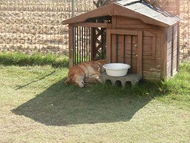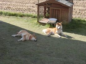 お気に入りの小屋でリクが日向ぼっこを始めると、銀も一緒に中へ入って来ました。
