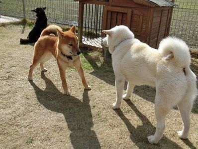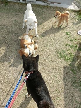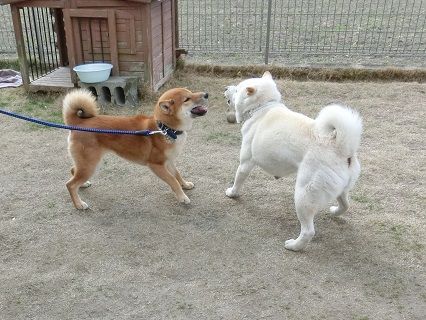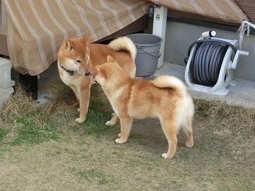 一匹前に先輩犬の福助にそんなことでも言ってる様にも見えてしまうちび子。(笑)
