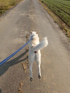 首輪もリードも新調して、この日も喜び勇んでみんなの元へやって来た福助。(楽)