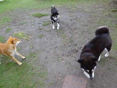 3匹の庭遊びが盛り上がり始めたところで、今度はリンがやって来てくれました。
