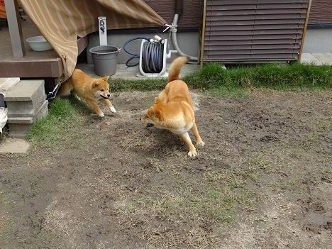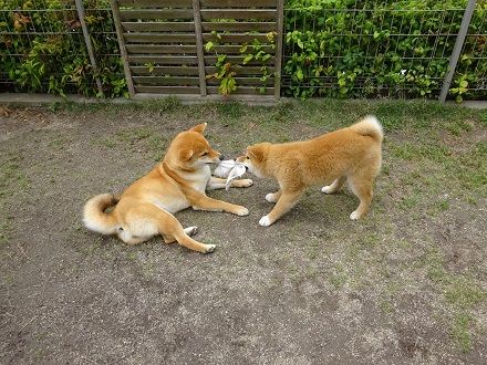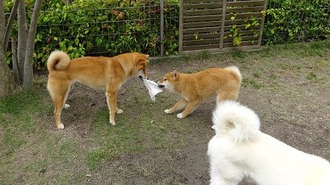 今度は結がタオルを口にしてナナを綱引きごっこに誘い始めました。(困)